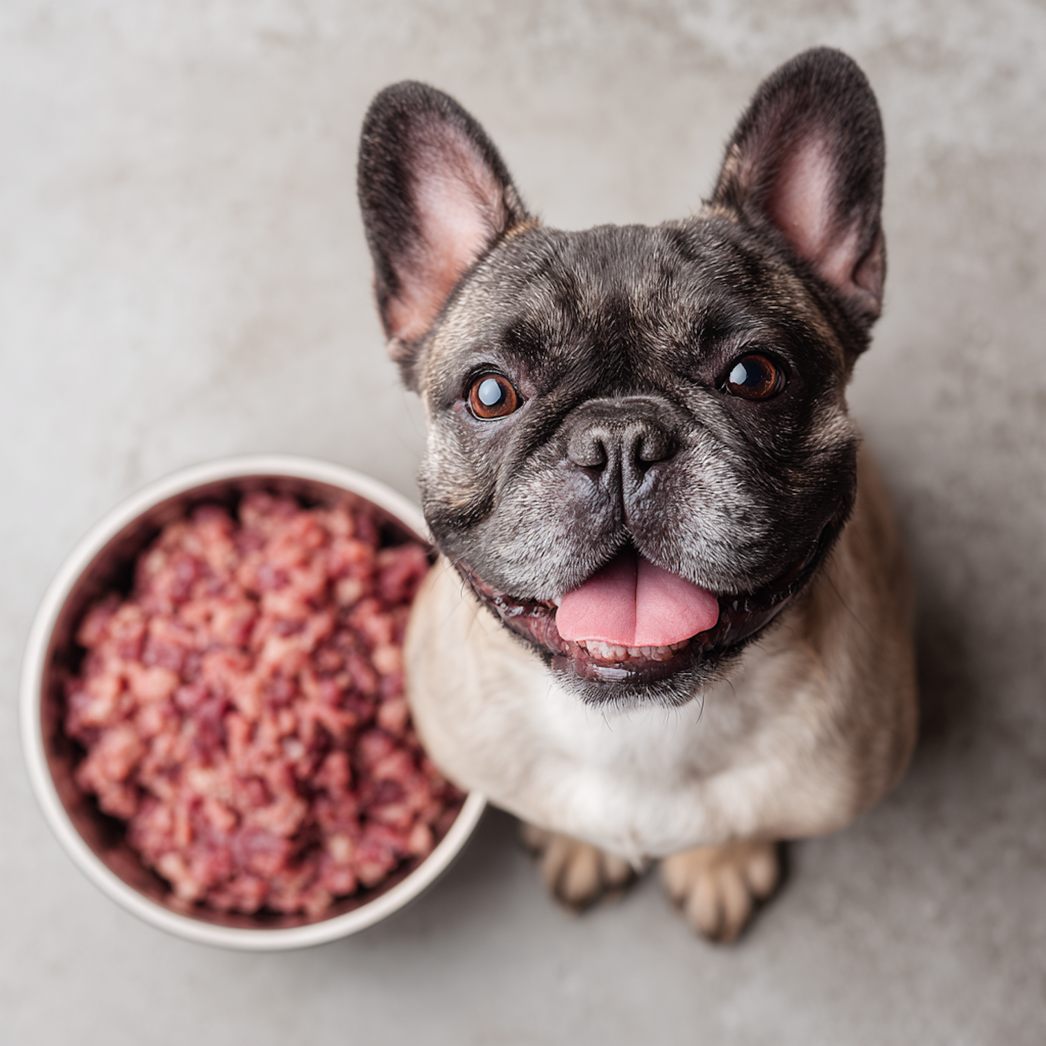 A happy French Bulldog sits next to a bowl of raw minced meat, looking up with a cheerful expression. Perfect pet and food moment.