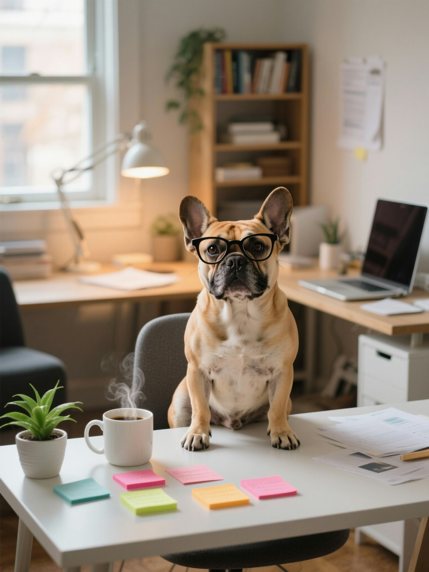 A French Bulldog wearing glasses sits on a desk in a cozy office, surrounded by sticky notes, coffee, and a potted plant.