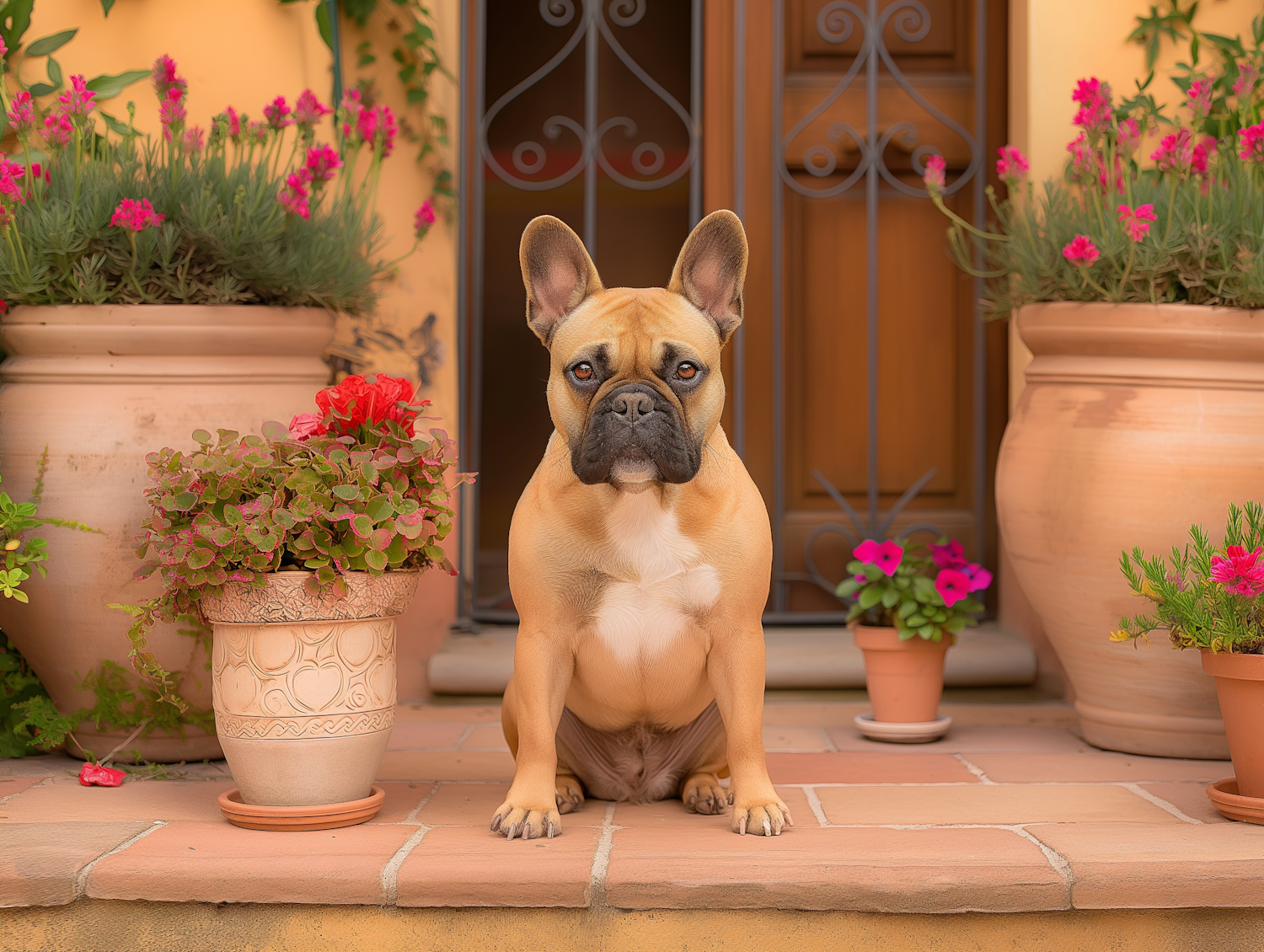 Adorable French Bulldog sitting on a terracotta doorstep surrounded by vibrant flowers in a Mediterranean-style setting.