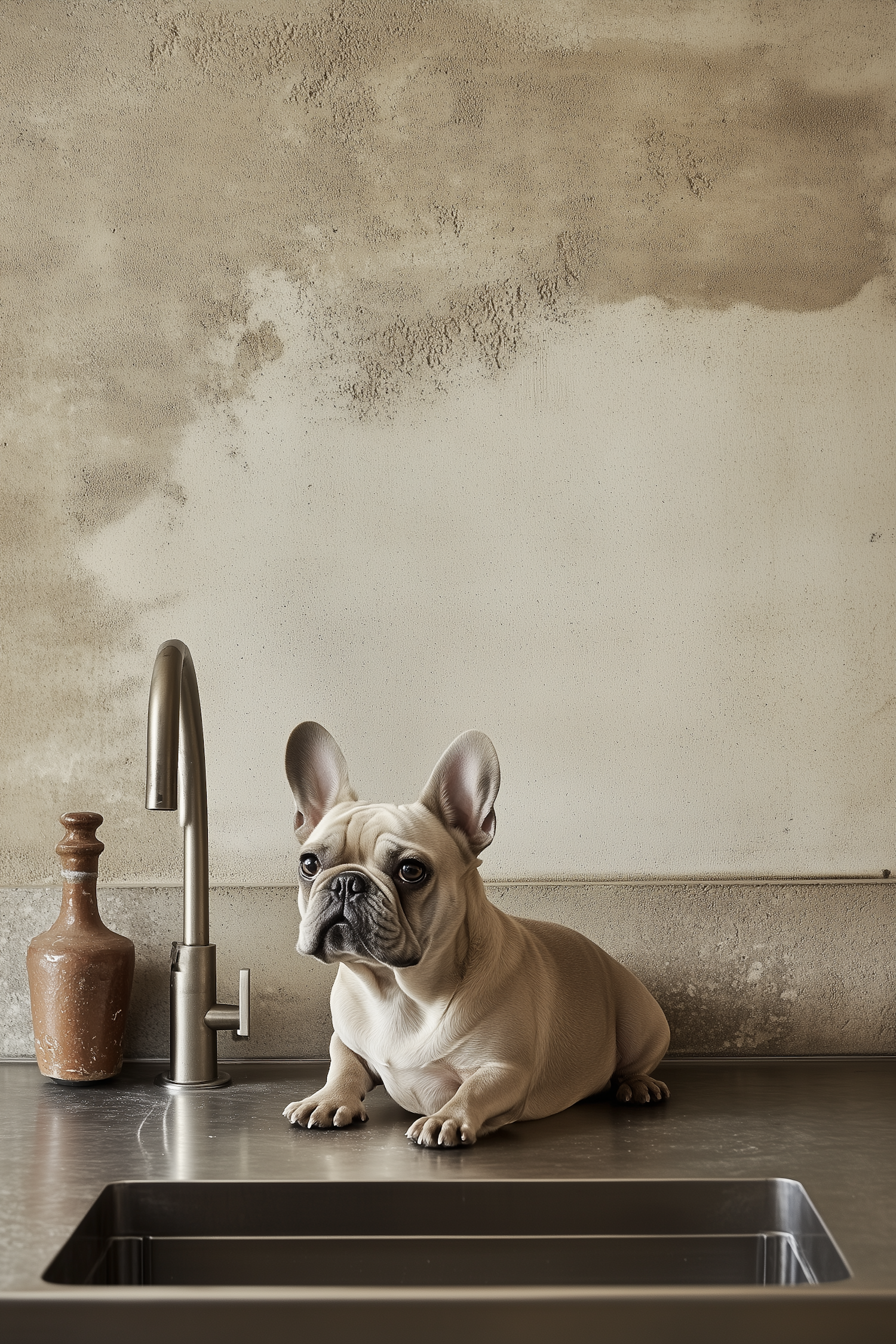 Adorable French Bulldog sitting on a modern kitchen countertop with a sleek faucet and rustic ceramic bottle.
