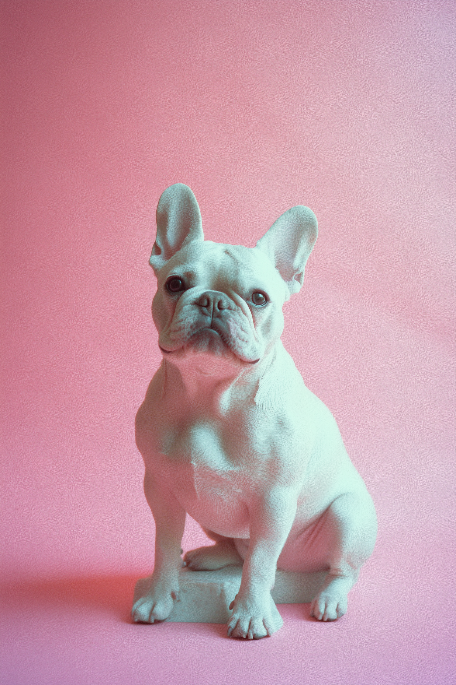Adorable white French Bulldog sitting against a pink background, showcasing its charm and elegance in a vibrant setting.