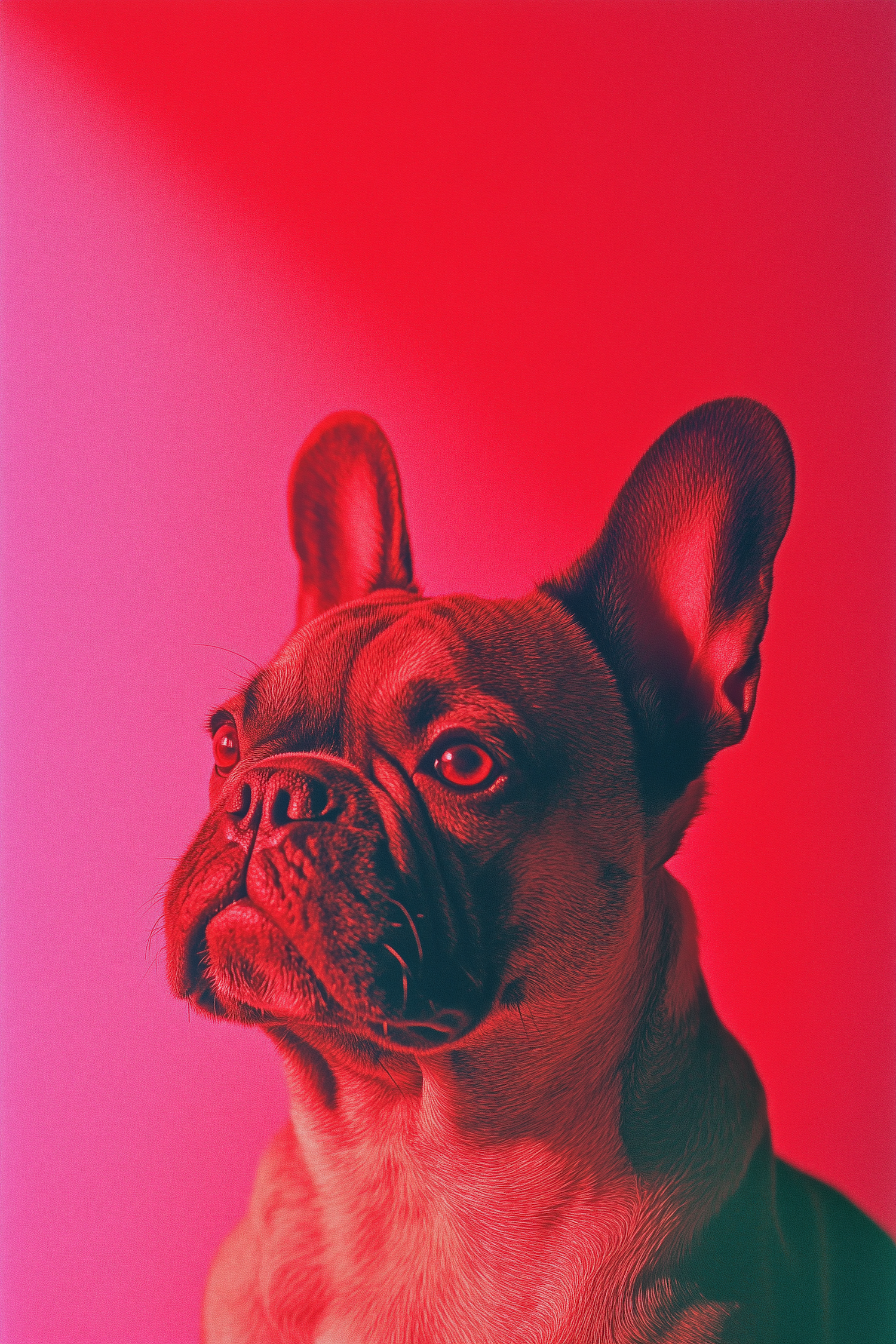 French Bulldog in dramatic red and pink lighting, highlighting its expressive face and upright ears against a smooth gradient background.