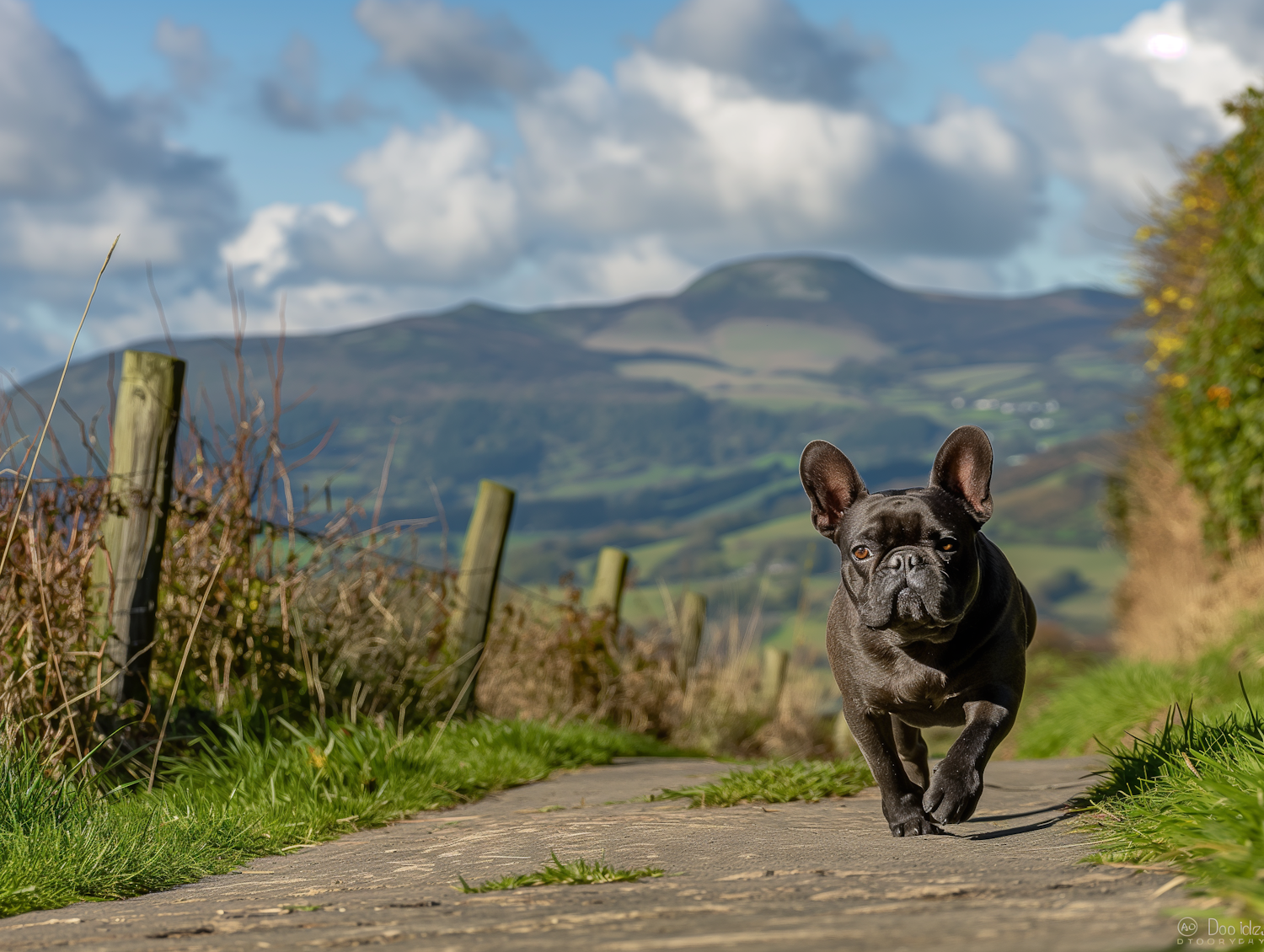 French Bulldog walking on a scenic path with rolling hills and a cloudy sky in the background.