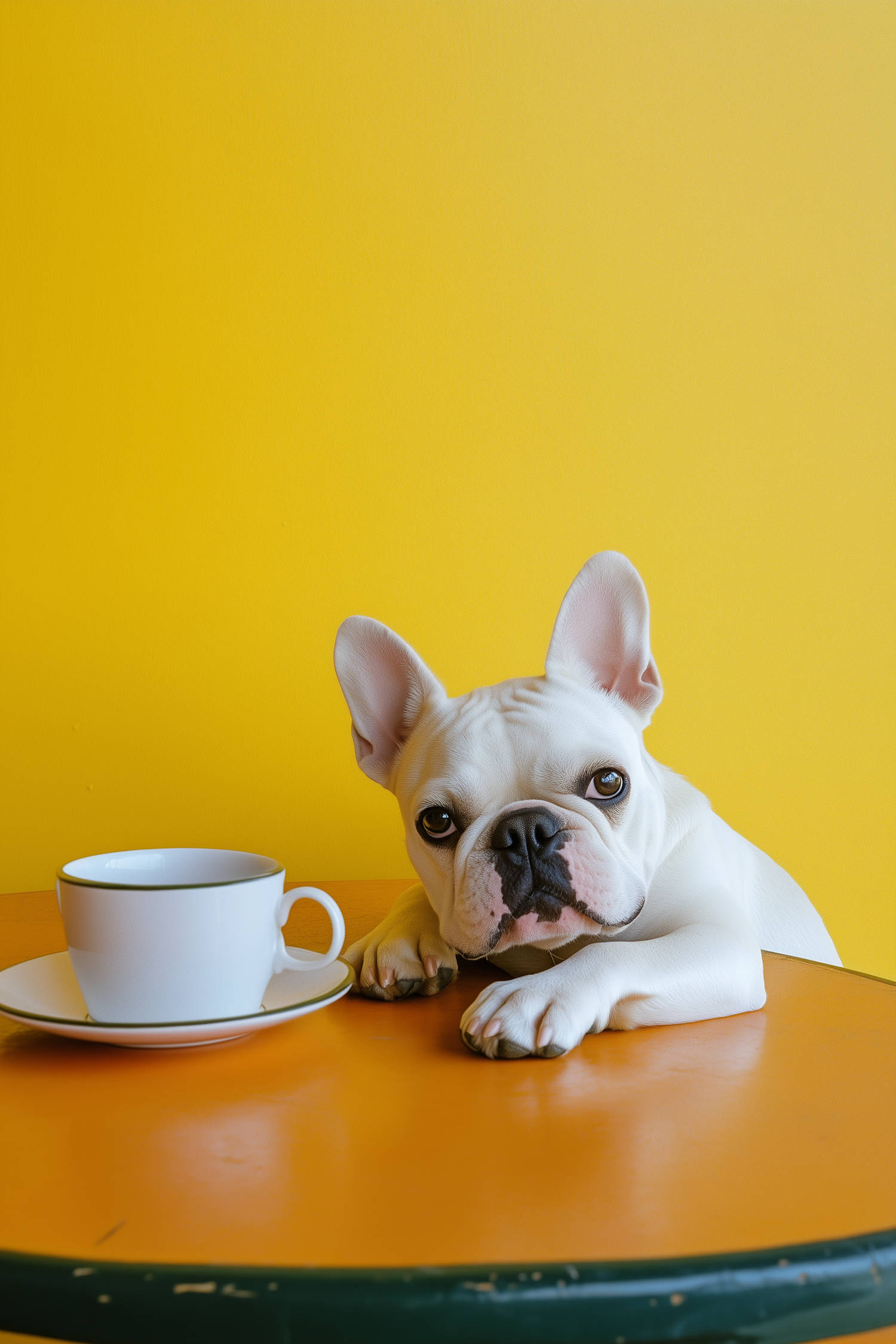 Charming white French Bulldog resting on an orange table with a cup, set against a vibrant yellow background.