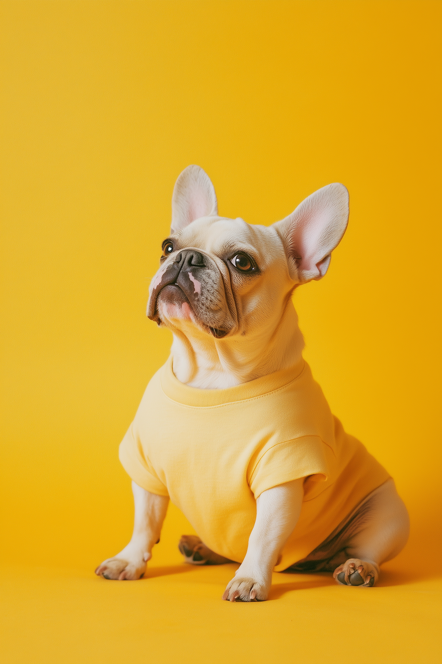 Adorable French Bulldog in a yellow t-shirt against a matching yellow background, exuding charm and playfulness.