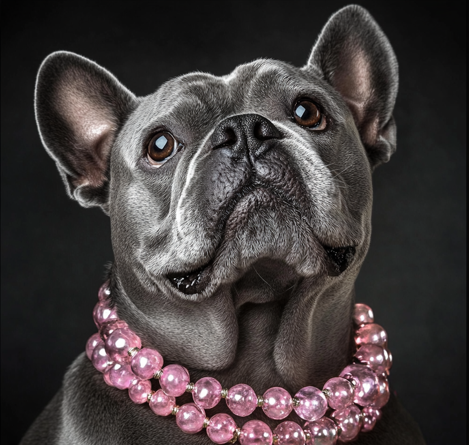 Charming French Bulldog with a pink bead necklace, gazing upward against a dark background. Elegant and playful portrait.