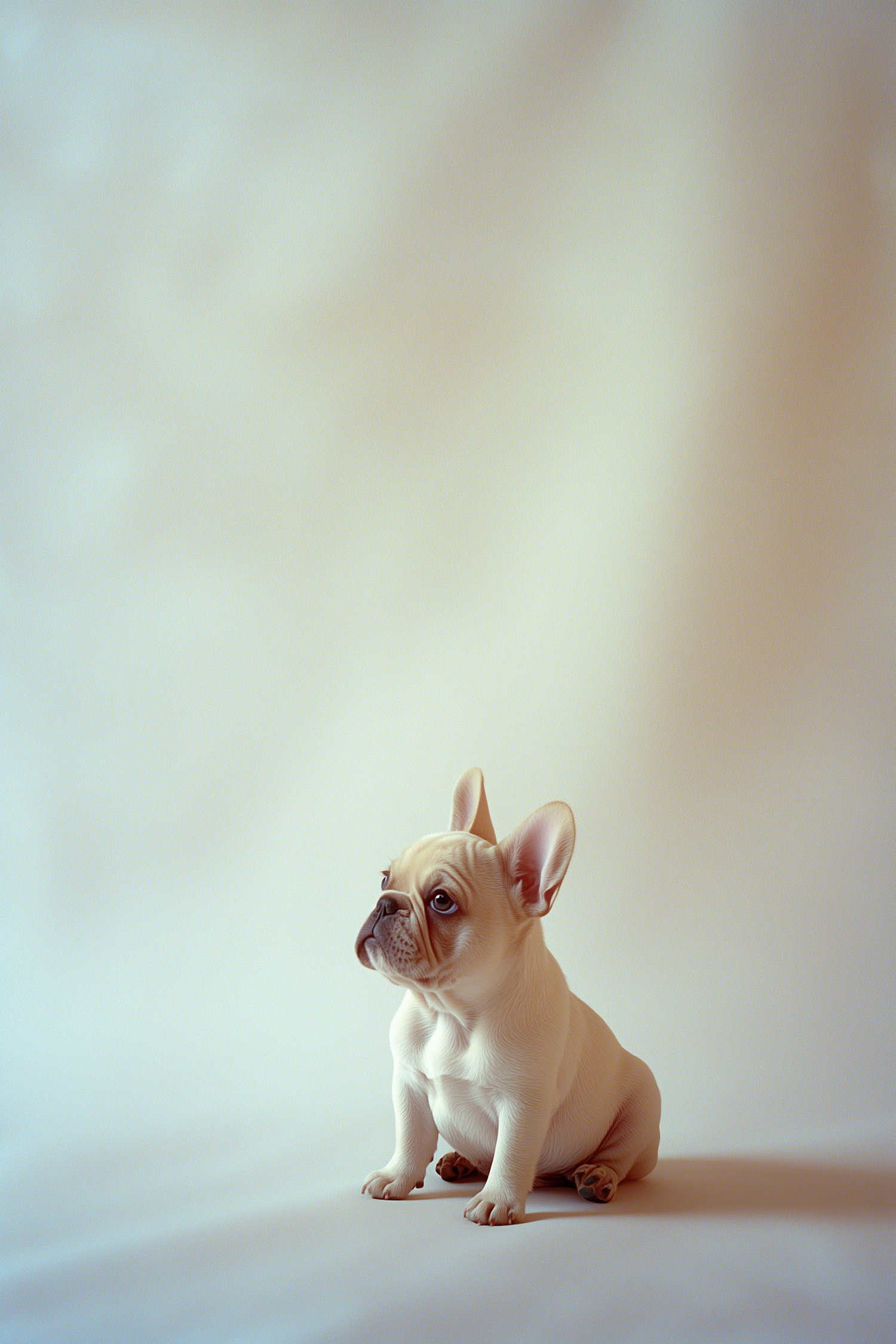 Adorable French Bulldog puppy with cream fur sitting on a light background, showcasing its expressive eyes and upright ears.