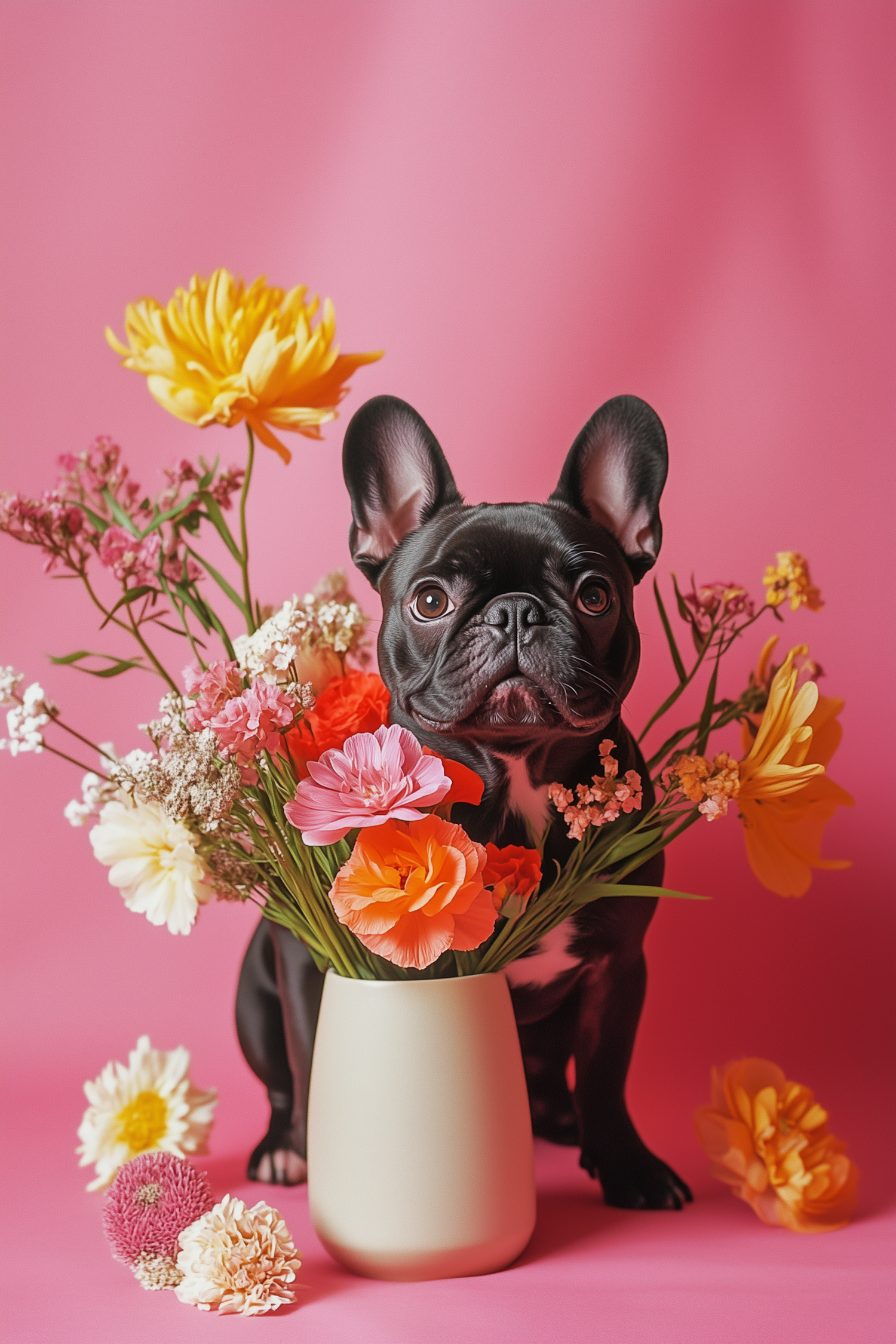 Adorable black French Bulldog with vibrant flowers in a vase against a pink background. Playful and colorful composition.