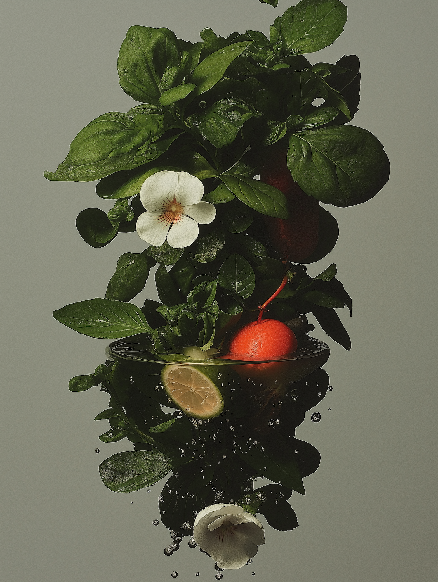 Fresh basil, white flower, lime slice, and cherry tomato submerged in water with bubbles, creating a vibrant and refreshing scene.