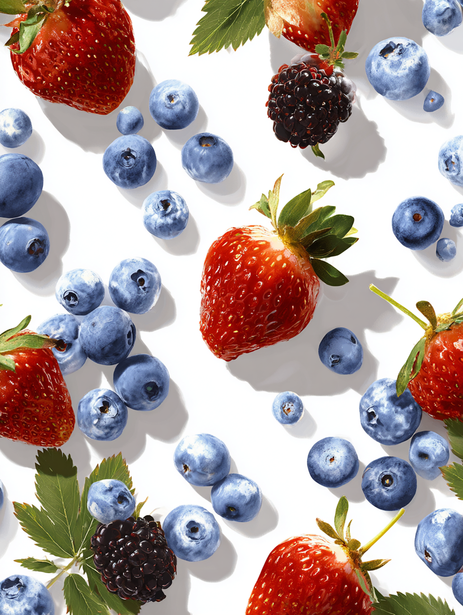 A colorful mix of strawberries, blueberries, and blackberries on a white background, showcasing their vibrant colors and fresh textures.