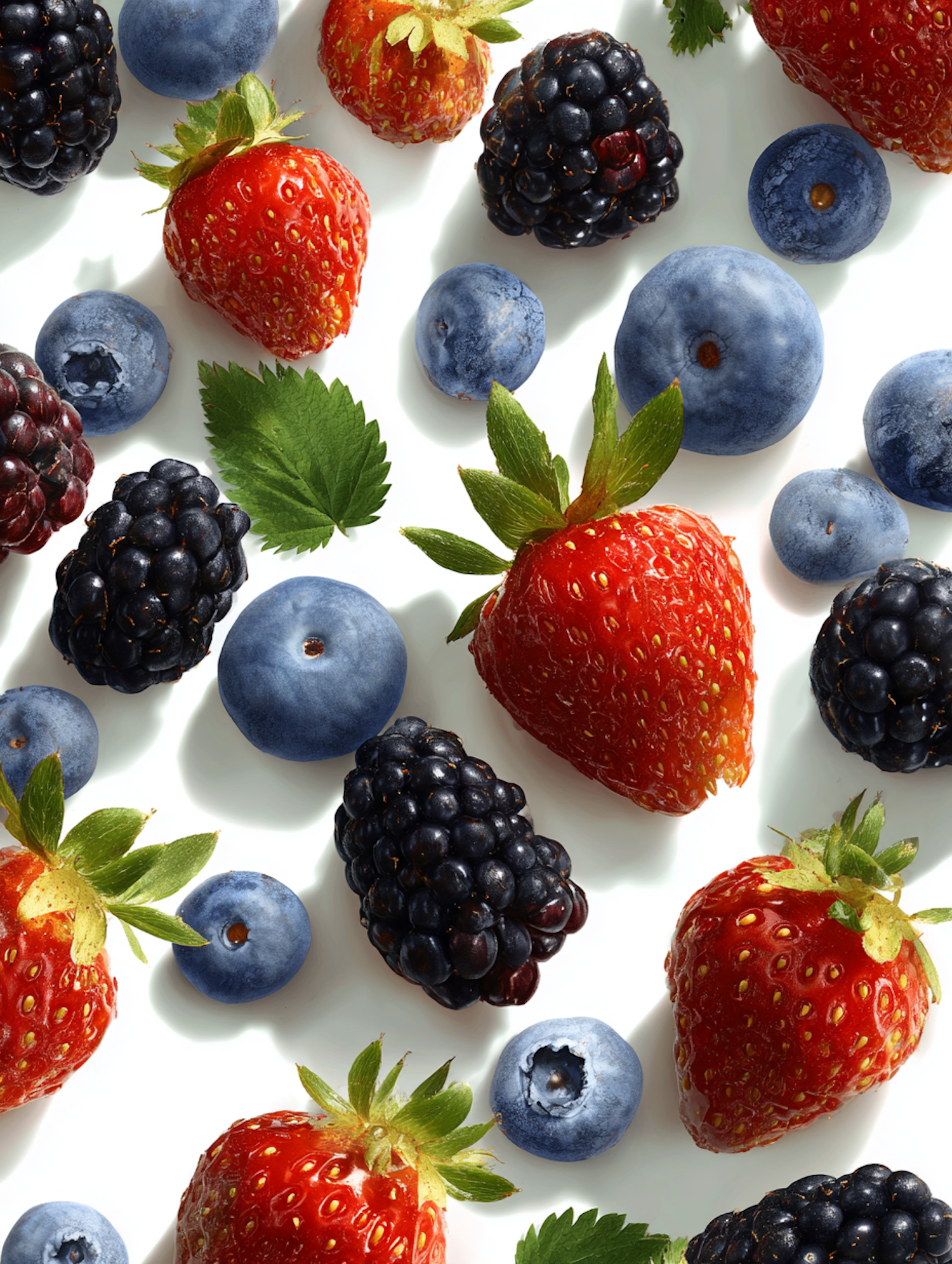 A colorful mix of strawberries, blackberries, and blueberries on a white background, showcasing their vibrant colors and fresh textures.