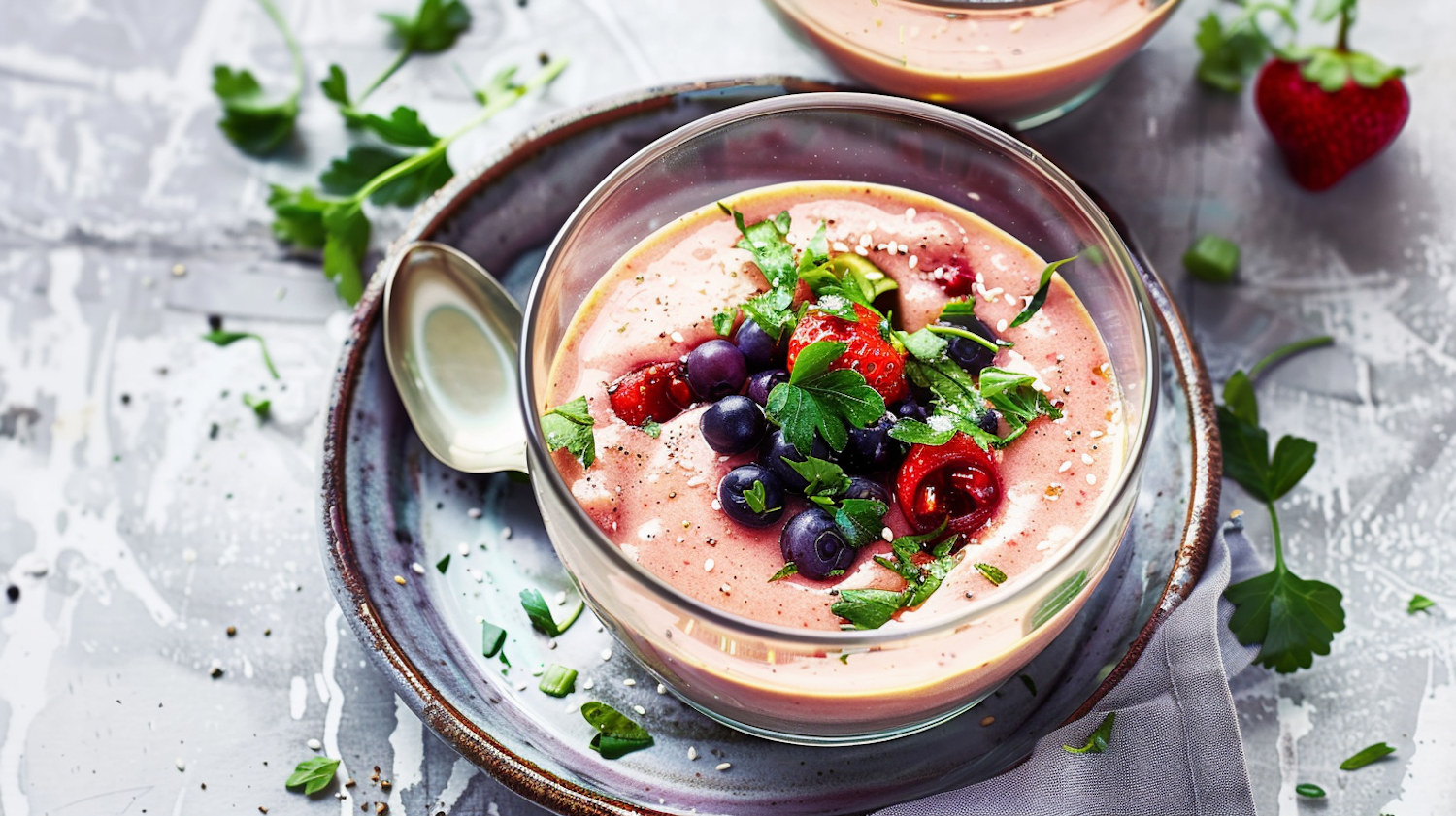 Colorful smoothie bowl with fresh berries and parsley on a rustic plate, featuring a vibrant pink smoothie and a silver spoon.