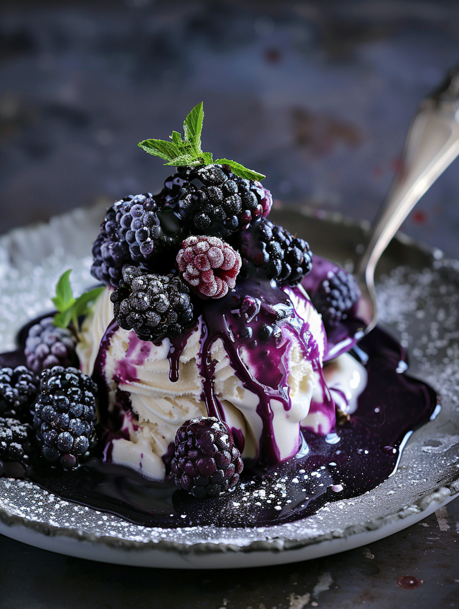 Vanilla ice cream topped with fresh blackberries, raspberry, and mint, drizzled with berry sauce on a dark plate.