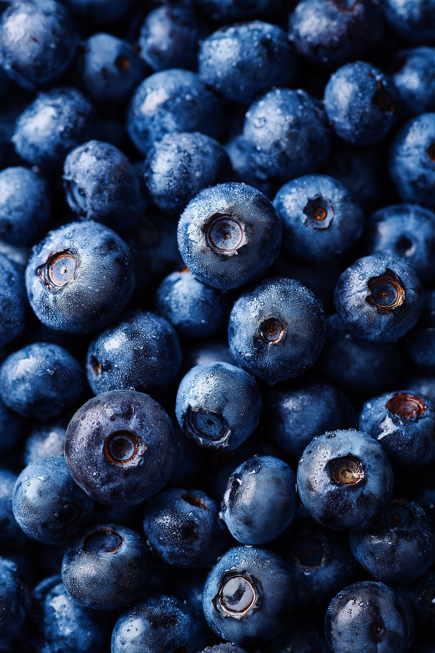 A close-up of fresh blueberries with a light layer of condensation, highlighting their vibrant blue color and natural texture.