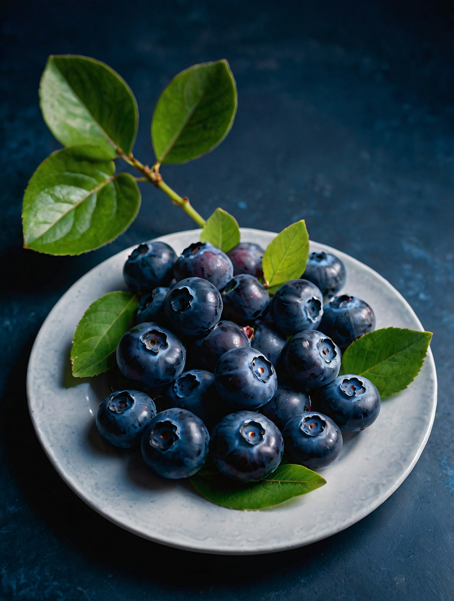 Fresh blueberries on a white plate with green leaves, set against a dark background. Vibrant colors and natural textures create a fresh look.