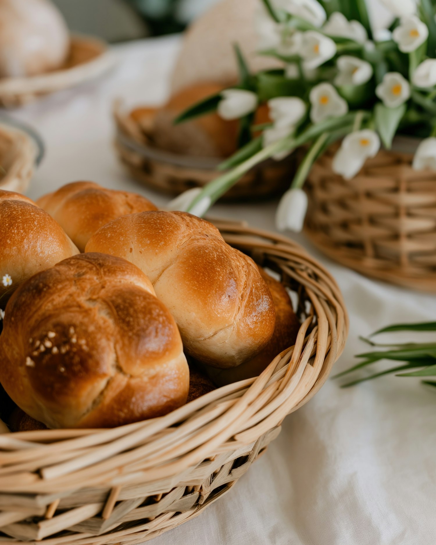 Freshly baked golden-brown bread rolls in a wicker basket, paired with white tulips on a cozy table setting.