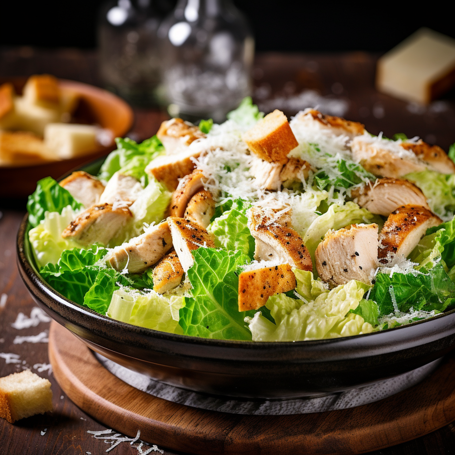 Delicious Caesar salad with grilled chicken, romaine lettuce, Parmesan, and croutons in a rustic bowl. Perfect for a healthy meal.