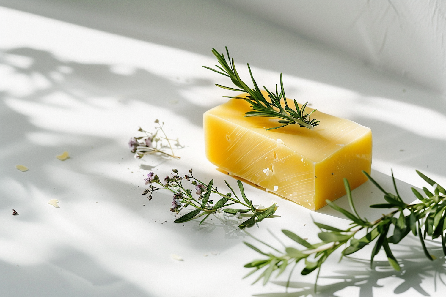 Yellow soap with rosemary and dried flowers on a white surface, creating a natural and serene atmosphere.