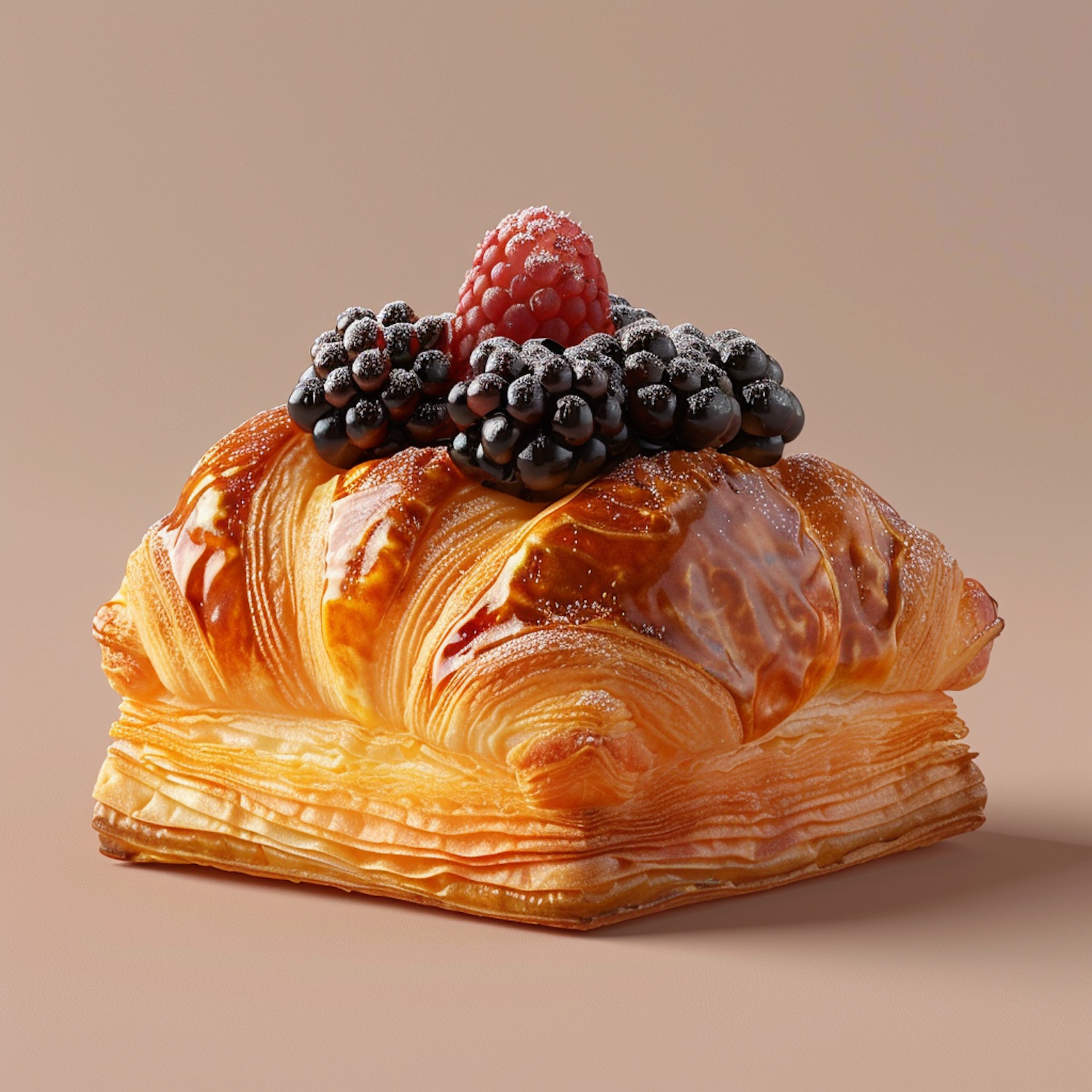 Golden pastry topped with fresh blackberries and a raspberry, dusted with powdered sugar on a neutral background.