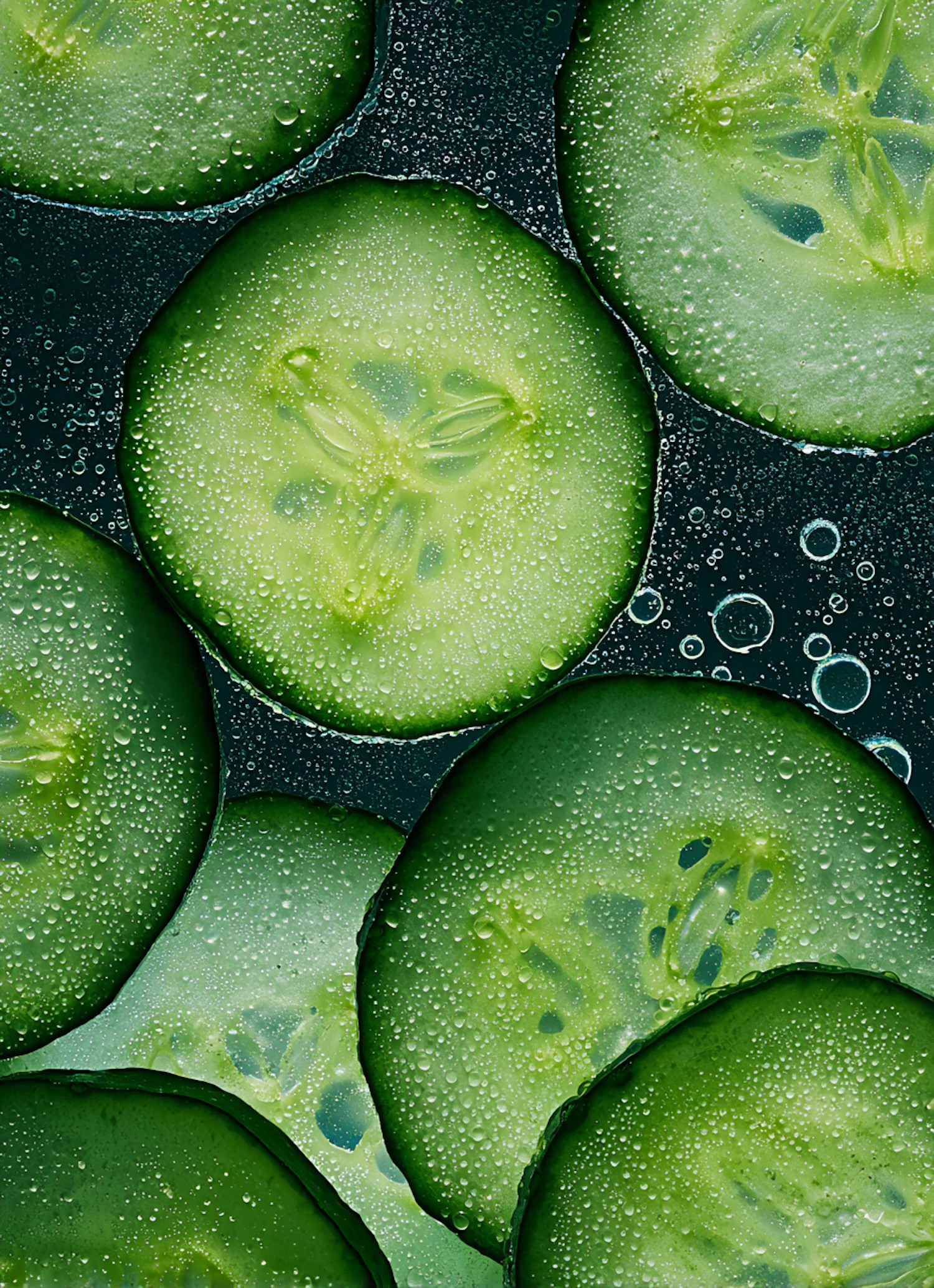 Close-up of fresh cucumber slices with water droplets, showcasing vibrant green hues and a refreshing, crisp texture.