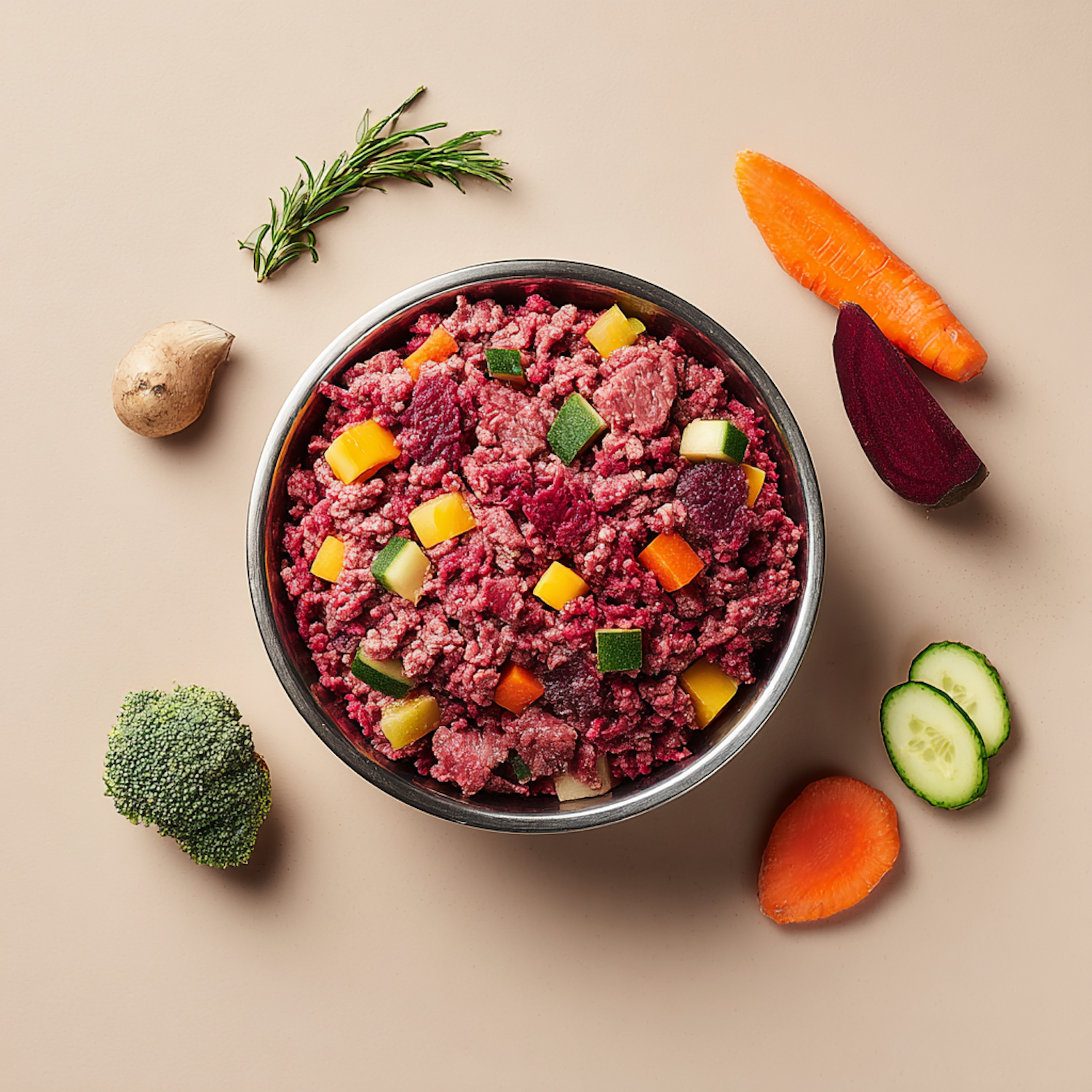 A bowl of raw dog food with minced meat and diced vegetables, surrounded by fresh ingredients like carrots, zucchini, and rosemary.