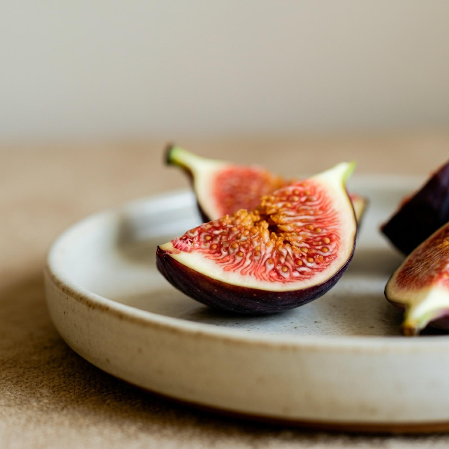 Freshly sliced figs with vibrant red flesh on a minimalist ceramic plate, perfect for showcasing natural textures and colors.