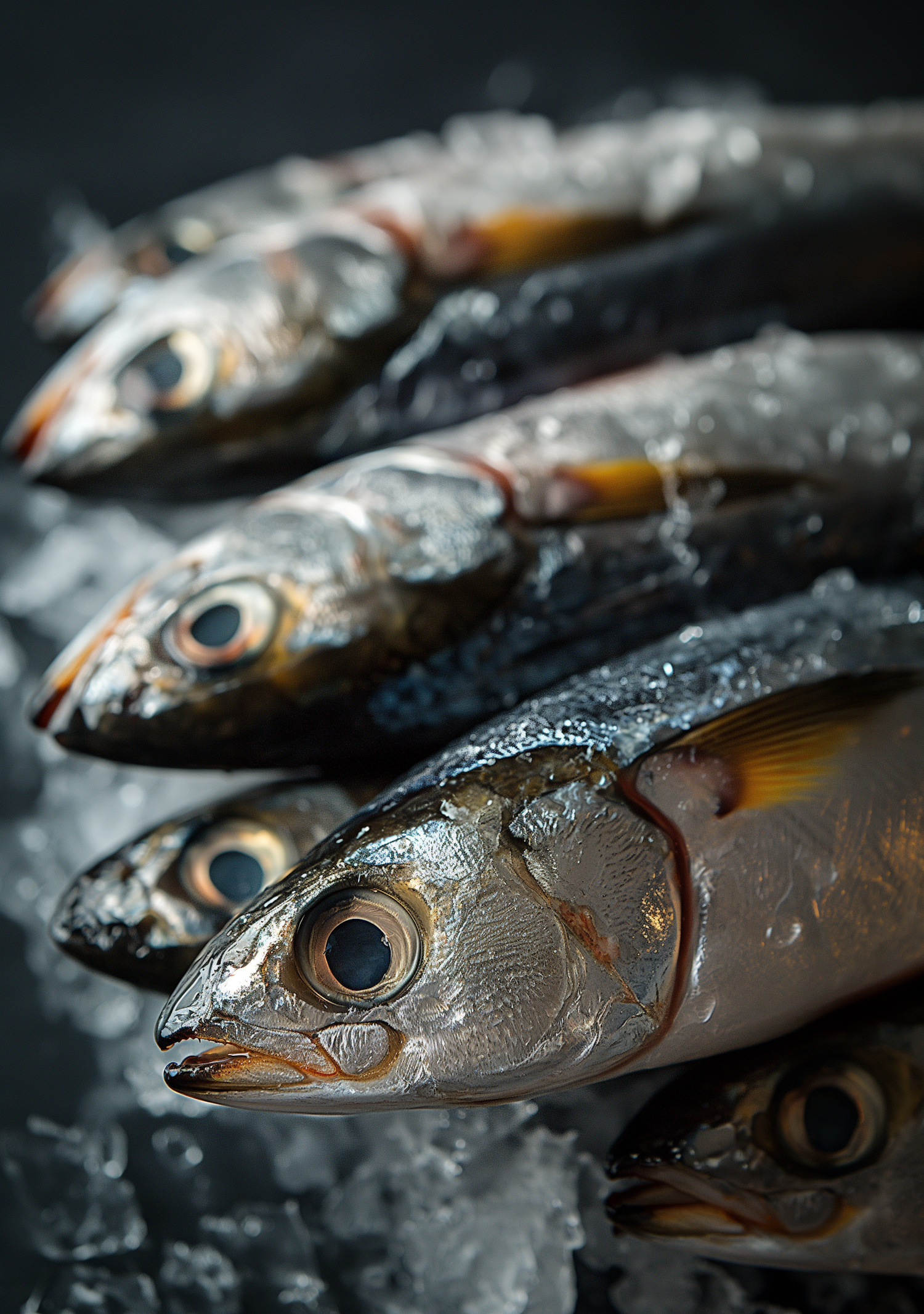 Close-up of fresh fish on ice, showcasing shiny scales and prominent eyes against a dark background.