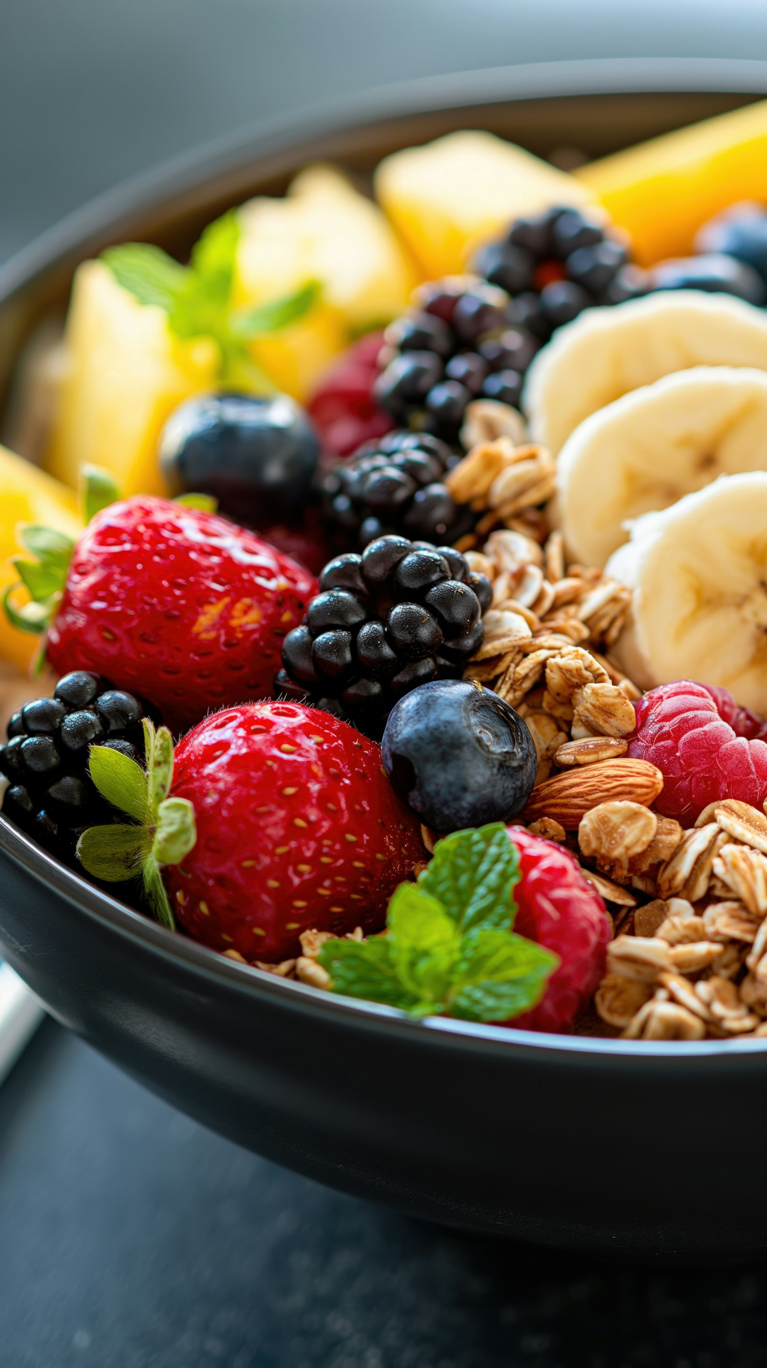 Colorful fruit and granola bowl with strawberries, blackberries, bananas, and mint leaves in a black bowl. Perfect healthy breakfast.