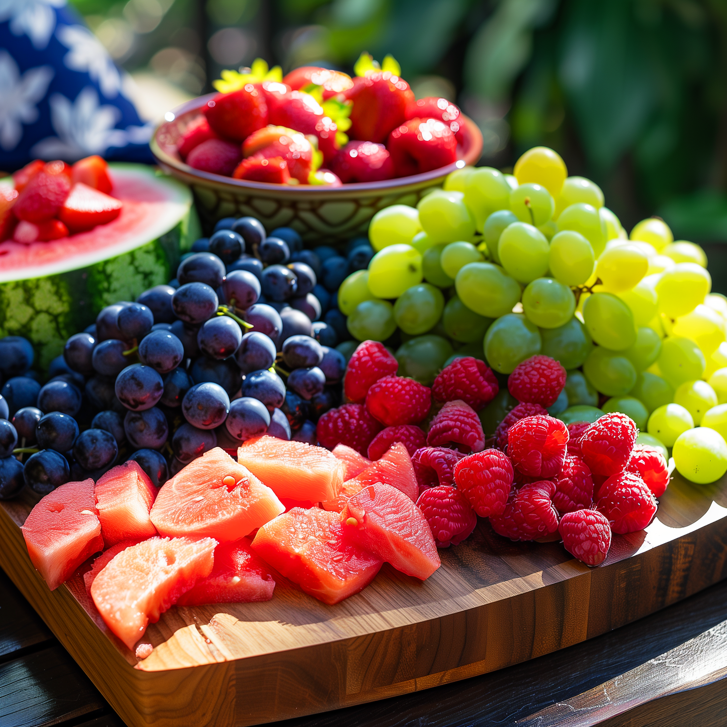 A colorful assortment of fresh fruits including watermelon, grapes, raspberries, and strawberries on a wooden board.