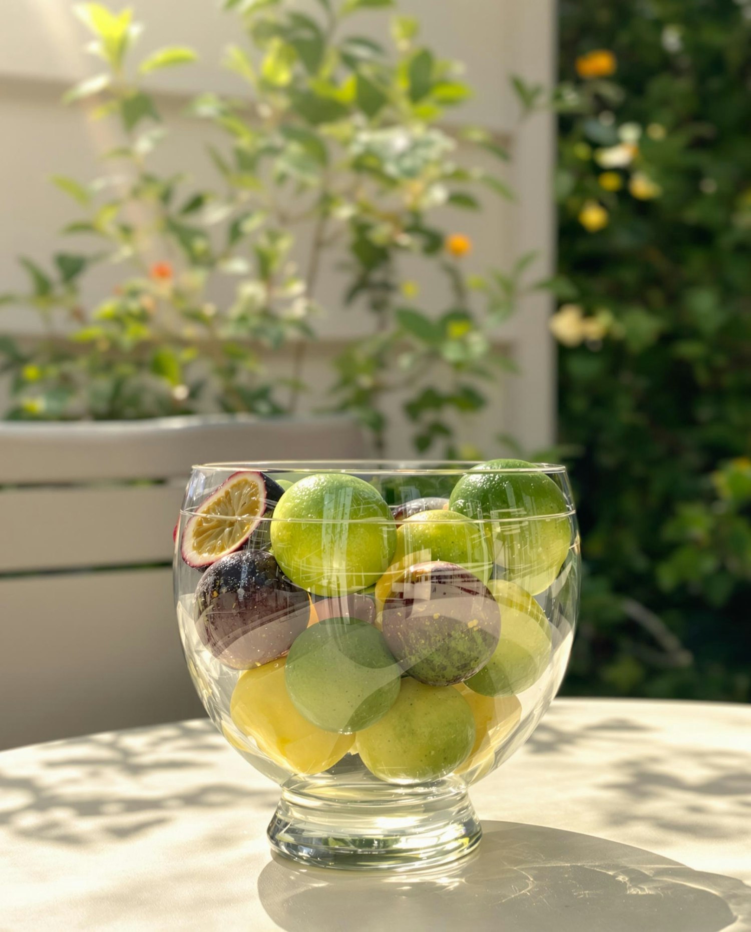 A glass bowl of fresh fruits, including apples, lemons, and passion fruits, sits on a sunlit table with a lush garden in the background.