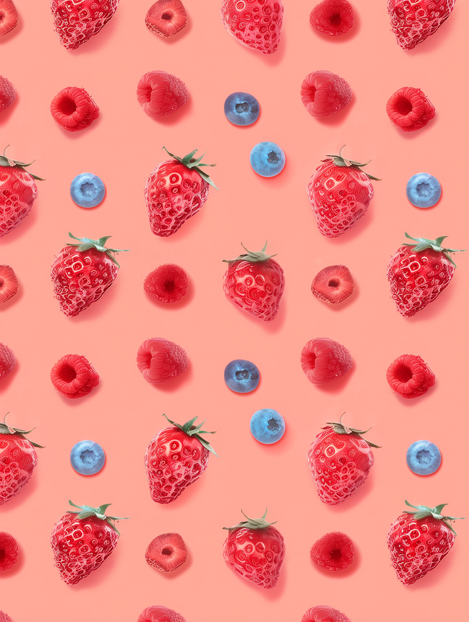 Bright strawberries, raspberries, and blueberries on a pink background create a fresh, colorful fruit pattern perfect for summer vibes.