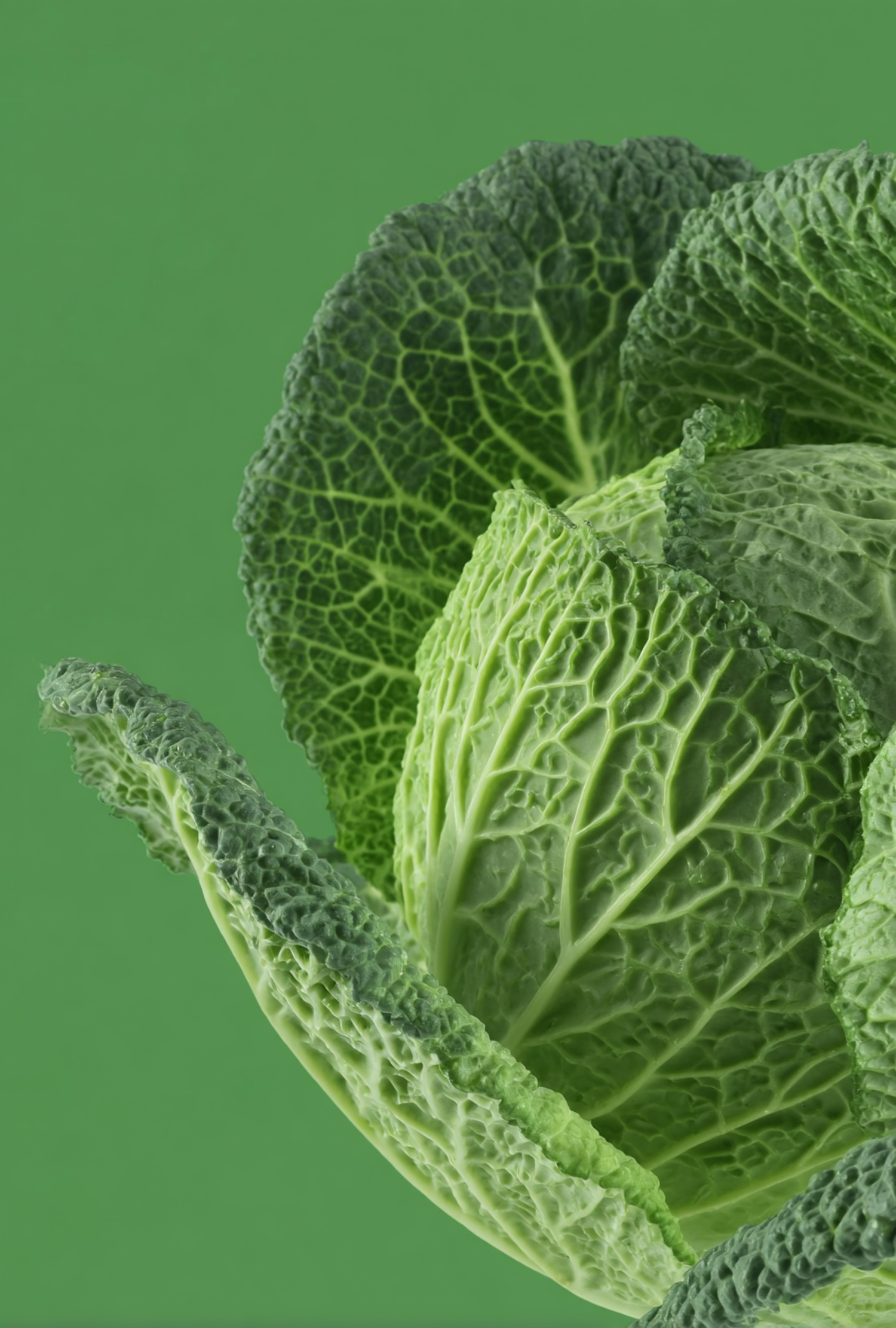Close-up of a fresh green cabbage with textured leaves, highlighting its intricate veining and vibrant color against a green background.