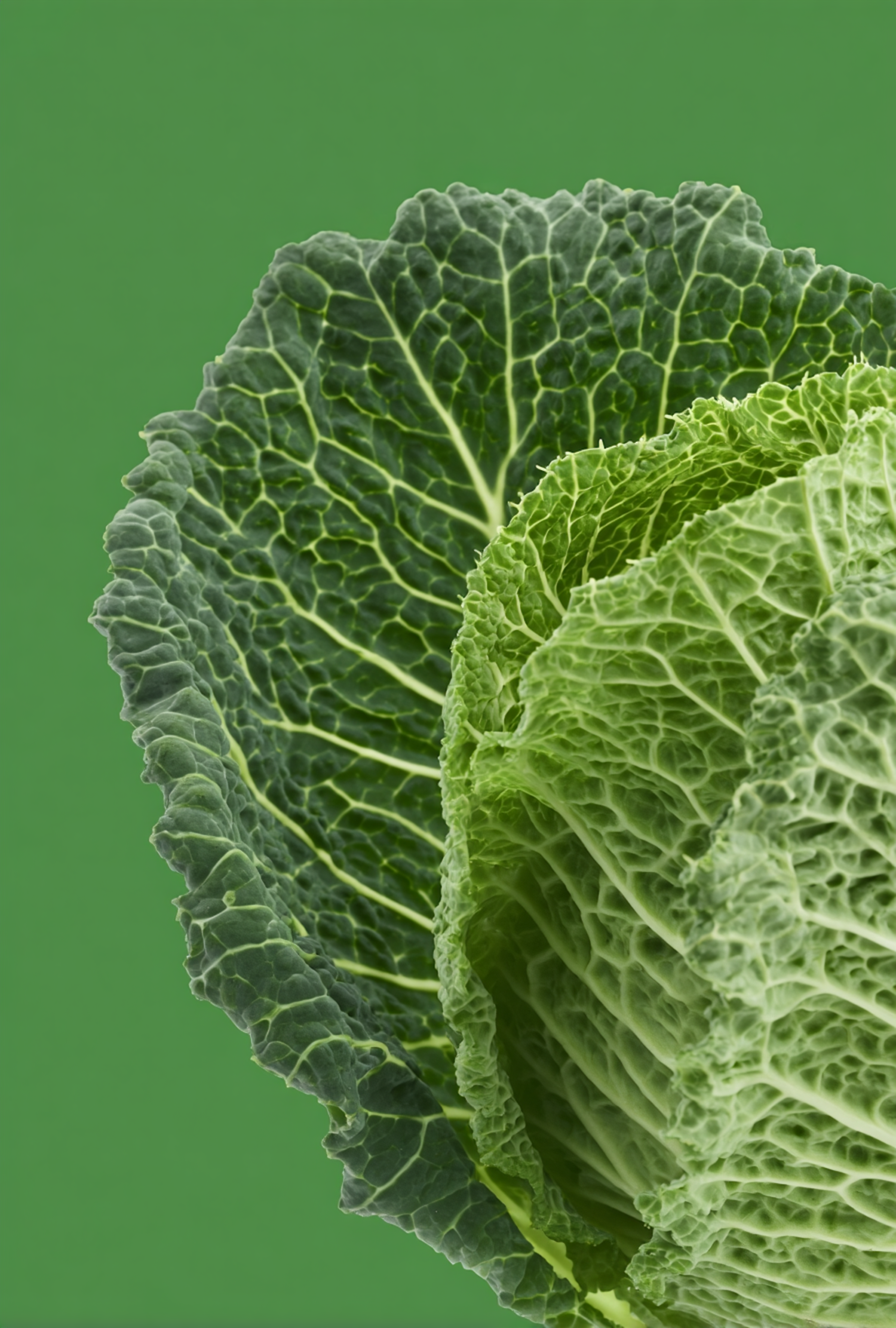 Close-up of a fresh green cabbage with detailed textured leaves against a solid green background, showcasing its natural beauty.