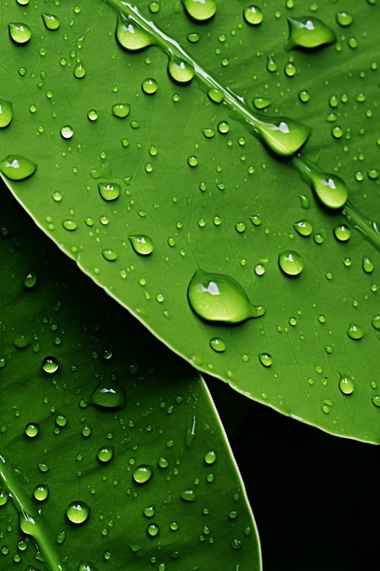 Close-up of green leaves with glistening water droplets, showcasing freshness and natural beauty in vivid detail.