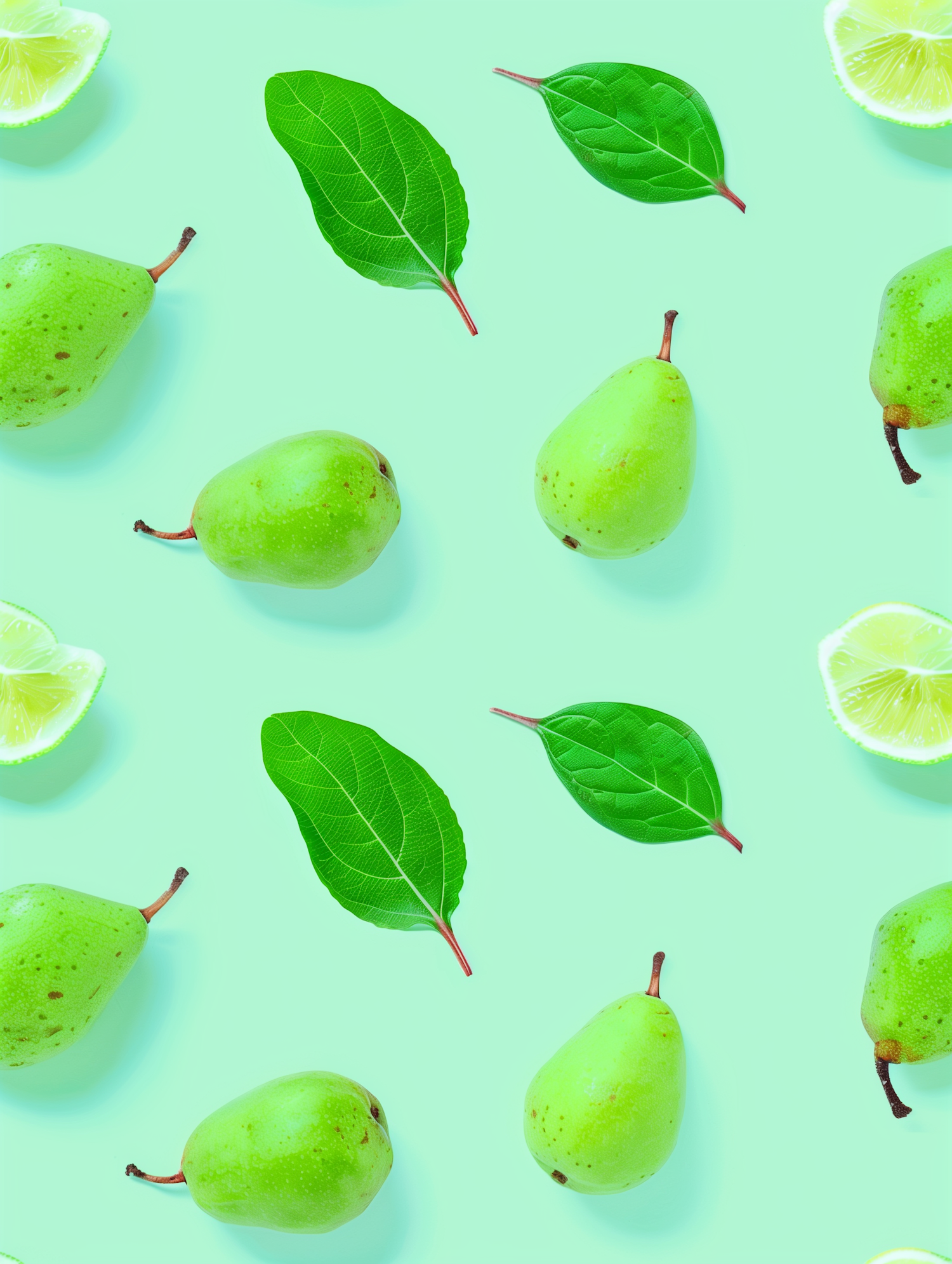 Bright green pears, fresh leaves, and lime wedges on a pastel mint green background create a vibrant, refreshing flat-lay composition.