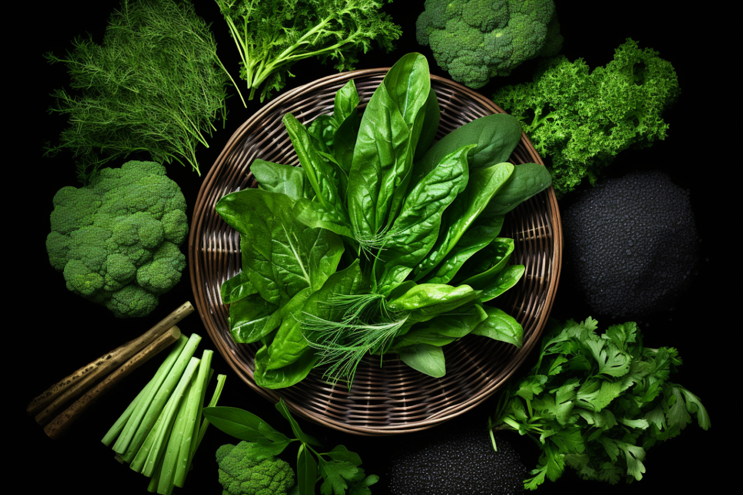 A vibrant display of fresh green vegetables, including spinach, broccoli, and kale, arranged in a wicker basket against a dark background.