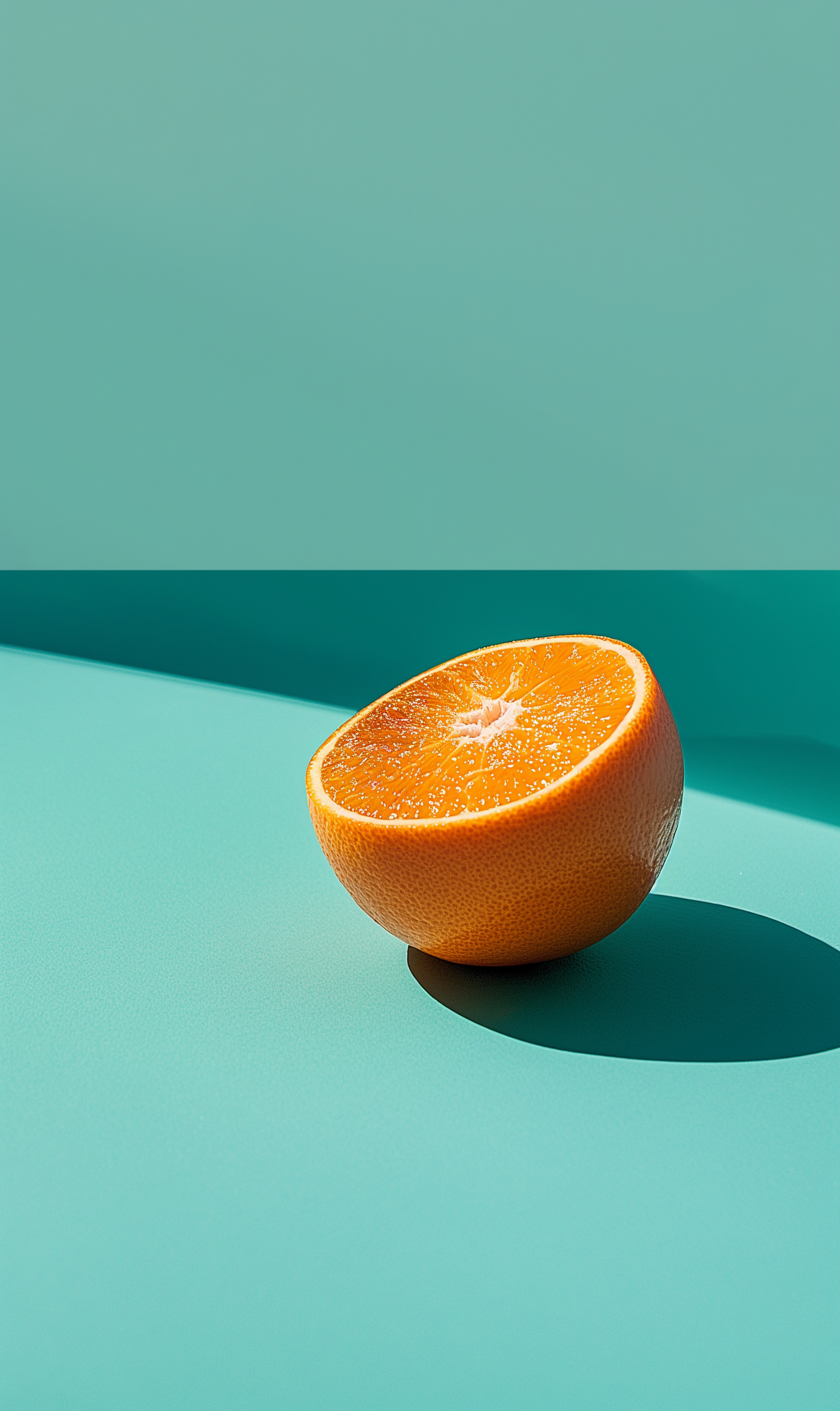 A fresh orange half on a teal surface with a soft shadow, showcasing vibrant colors and a modern minimalist aesthetic.