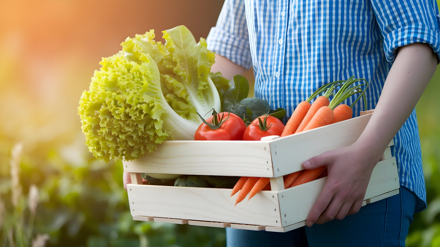 Freshly harvested vegetables in a wooden crate, including lettuce, carrots, and tomatoes, held by a person in a sunny outdoor field.