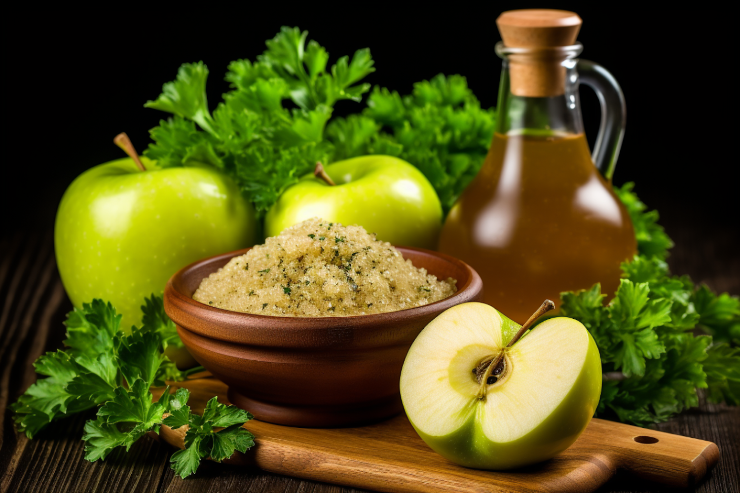 Fresh green apples, parsley, sugar scrub, and apple cider vinegar in a rustic setup with wooden accents and vibrant greenery.