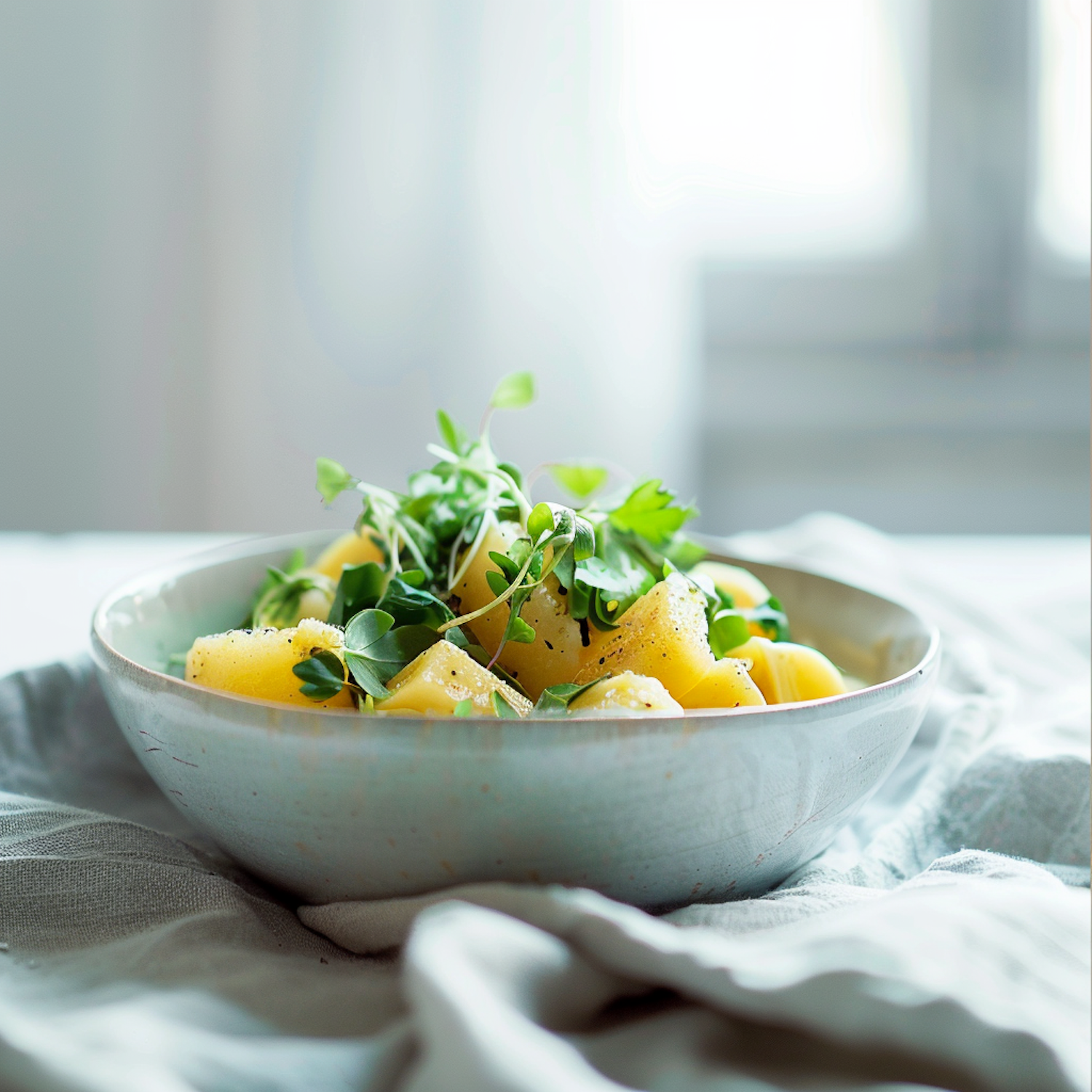 Fresh potato salad with microgreens and parsley in a ceramic bowl, set on a light cloth, creating a bright and airy dining scene.