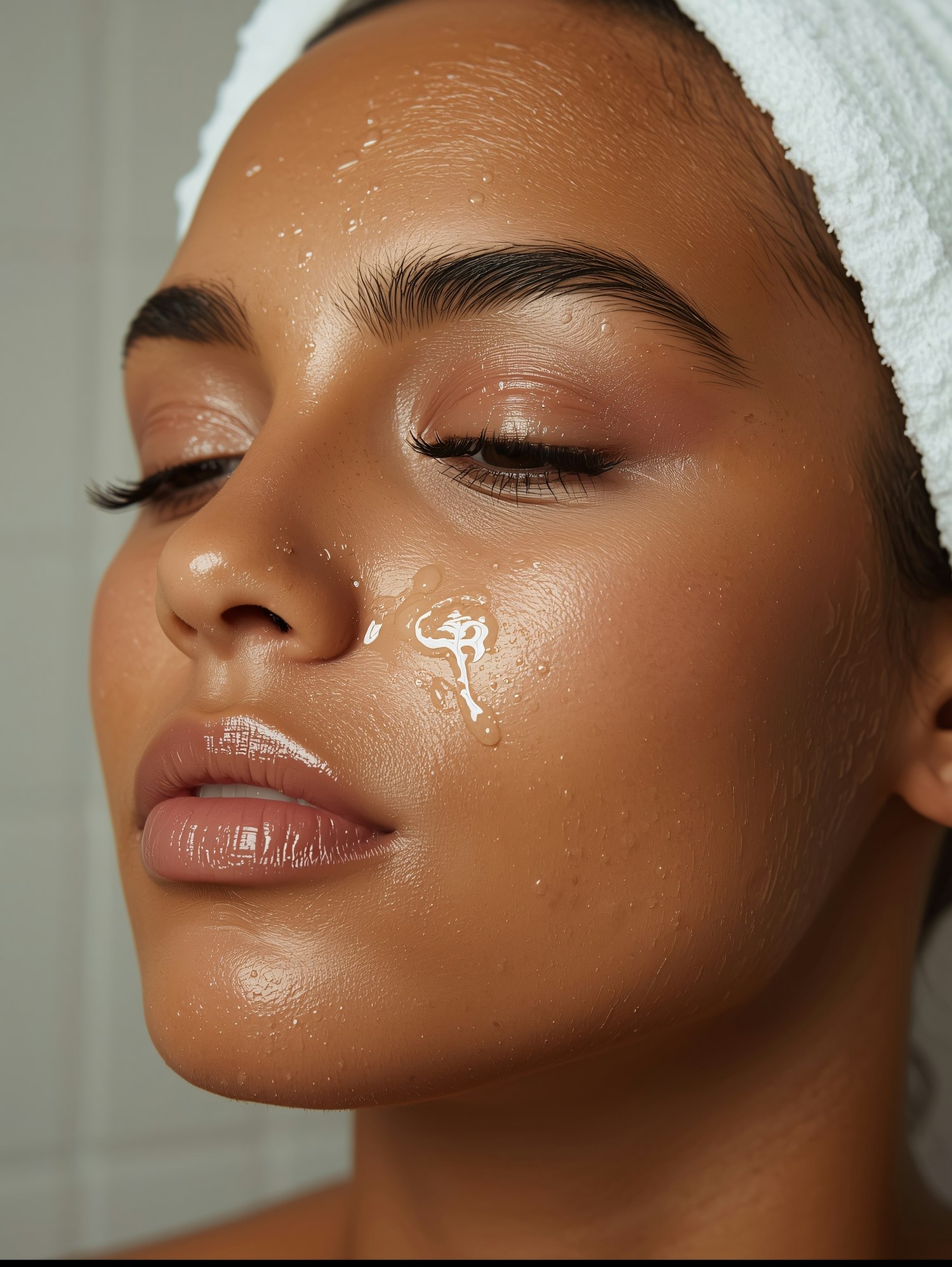 Close-up of a hydrated face with water droplets, glossy lips, and a towel-wrapped head, showcasing a fresh and radiant look.