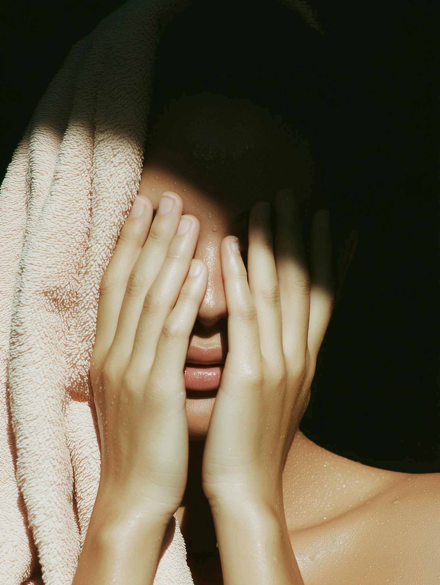 A close-up of a person with hands covering their face, water droplets on skin, and a towel draped over their head, in dramatic lighting.