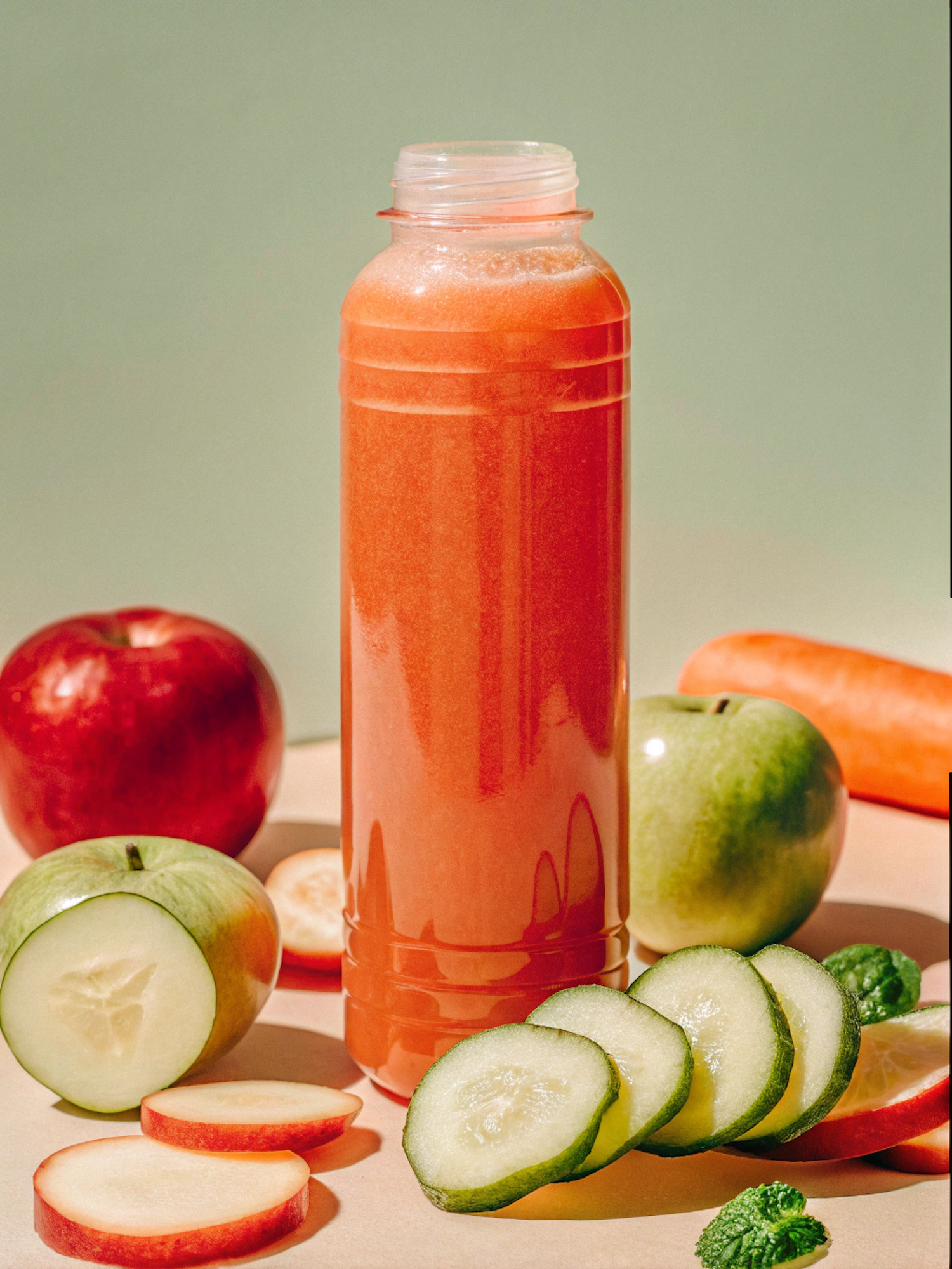 Bright orange juice bottle surrounded by fresh apples, cucumber slices, carrot, and mint leaves on a soft green background.