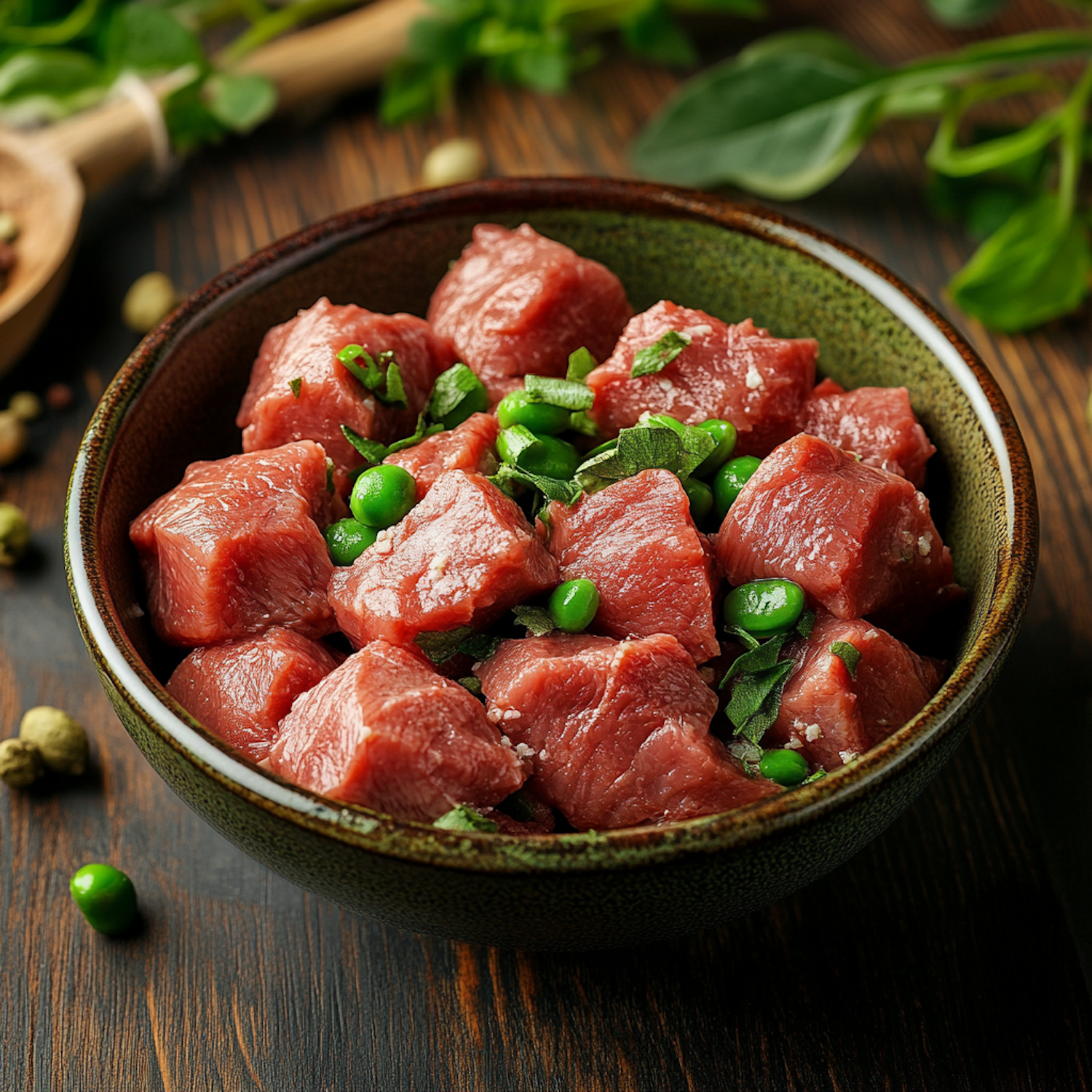 Fresh cubed beef with green peas and herbs in a rustic bowl on a wooden table, perfect for a hearty meal preparation.