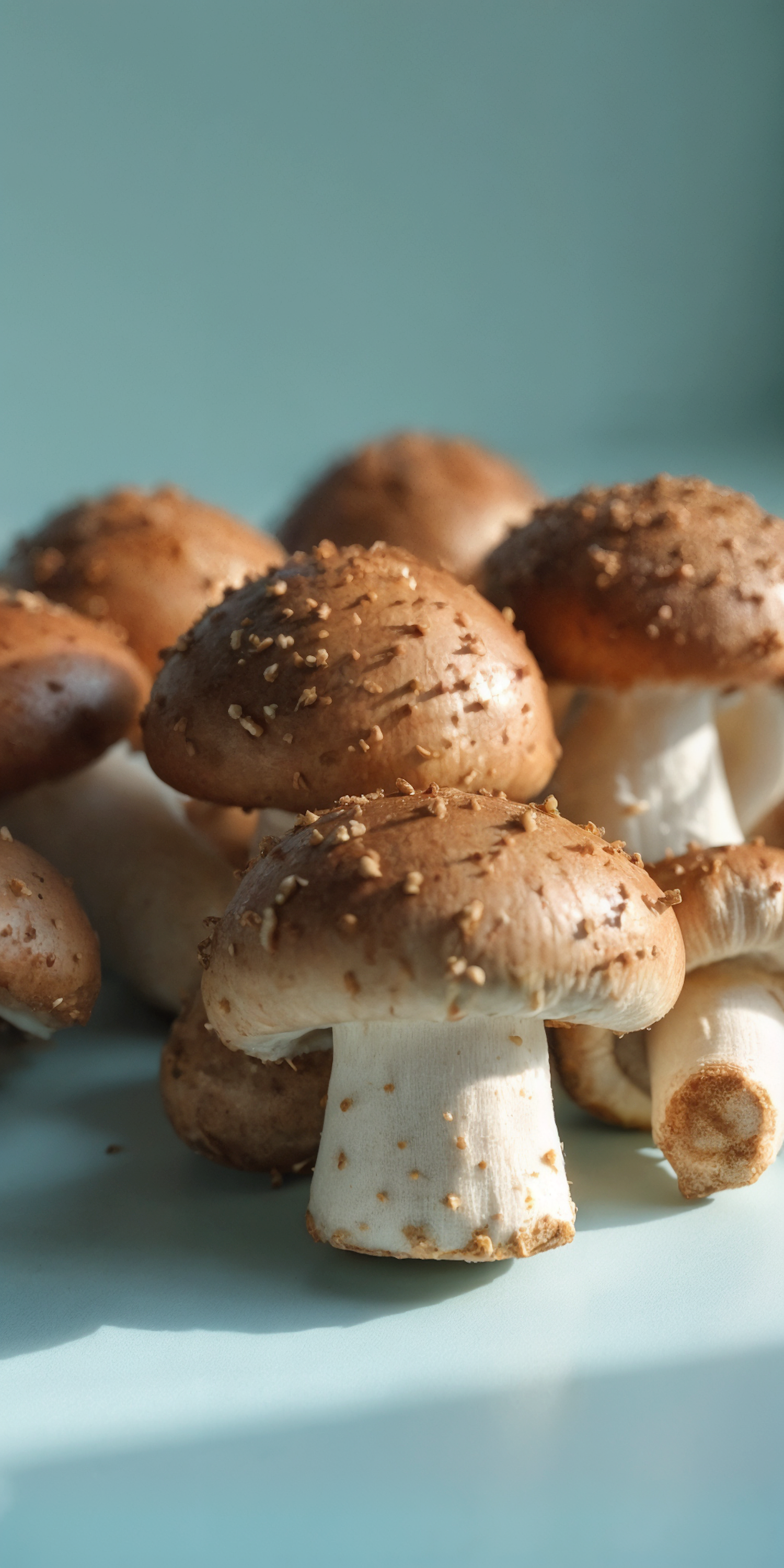 Close-up of fresh mushrooms with brown caps and white stems on a light blue surface, showcasing their natural texture and earthy tones.