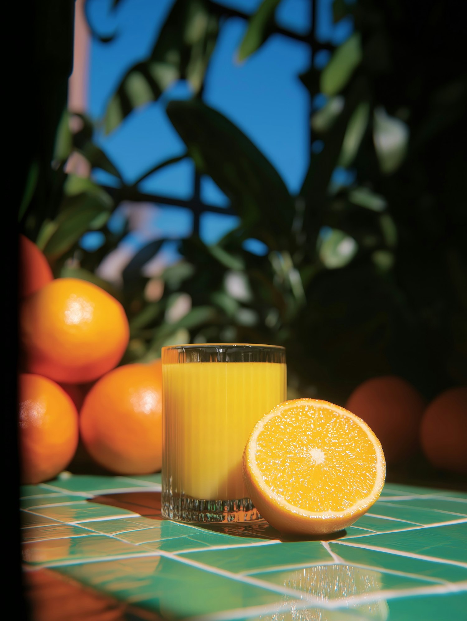 A glass of fresh orange juice with a halved orange on a green tiled surface, surrounded by whole oranges and lush greenery under a blue sky.