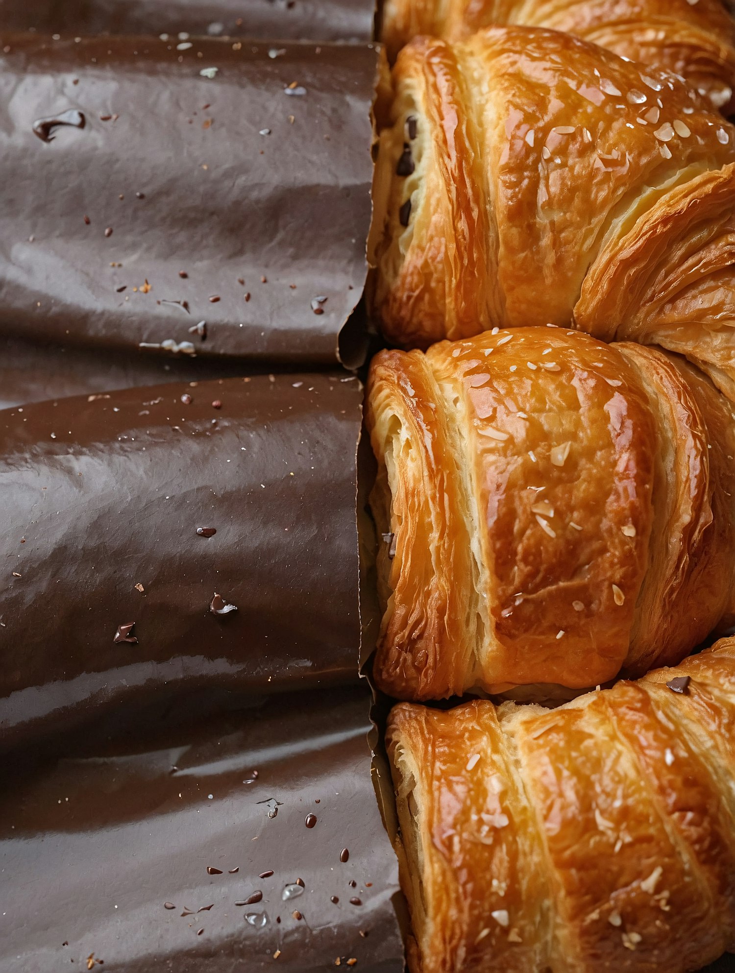 Golden, flaky pain au chocolat with glossy chocolate coating and sea salt flakes, perfect for a sweet and savory treat.