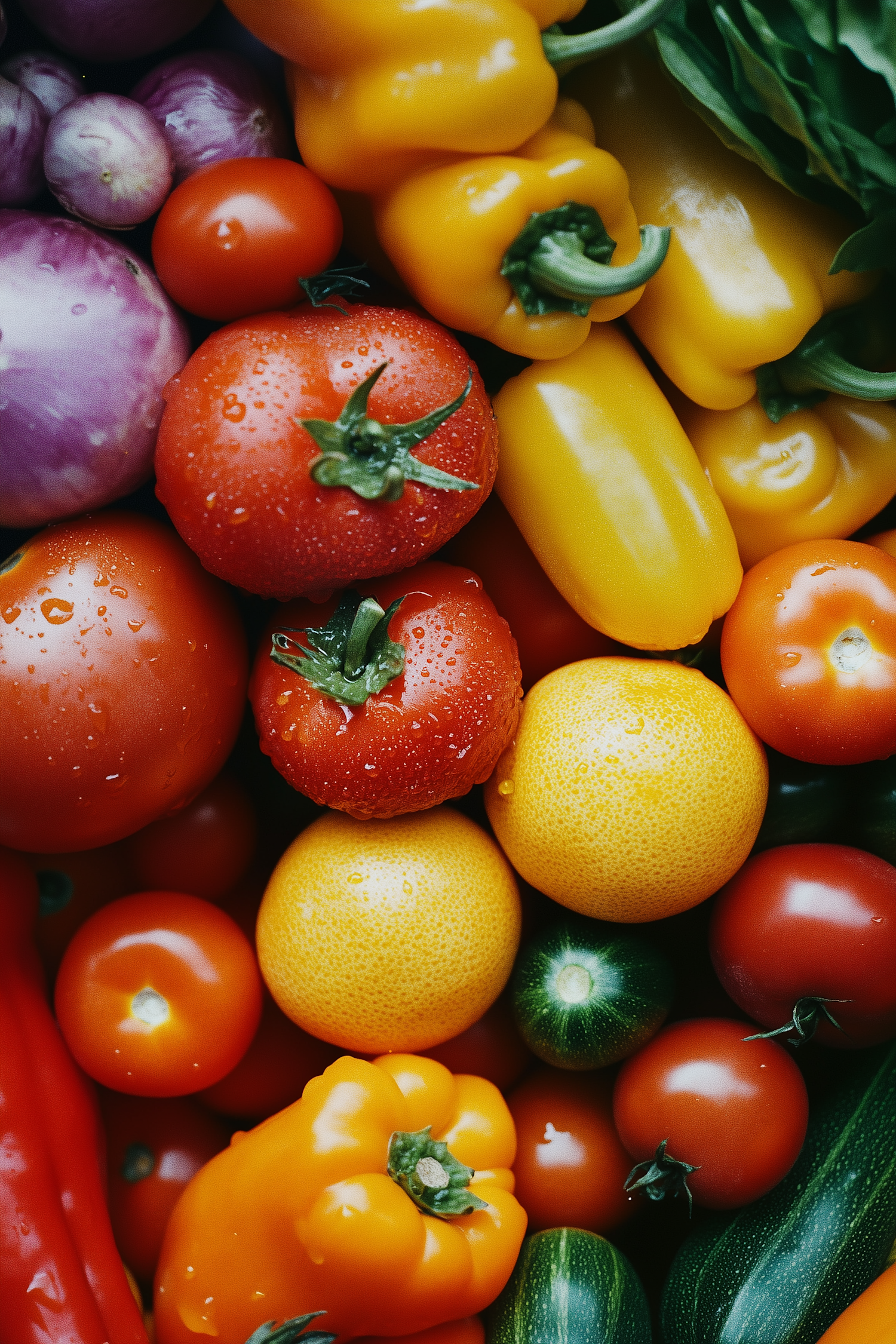 A colorful mix of fresh tomatoes, bell peppers, onions, citrus fruits, and zucchinis, glistening with water droplets, in a vibrant arrangement.