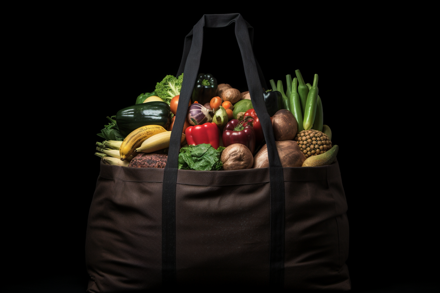A tote bag overflowing with colorful fresh fruits and vegetables against a black background.