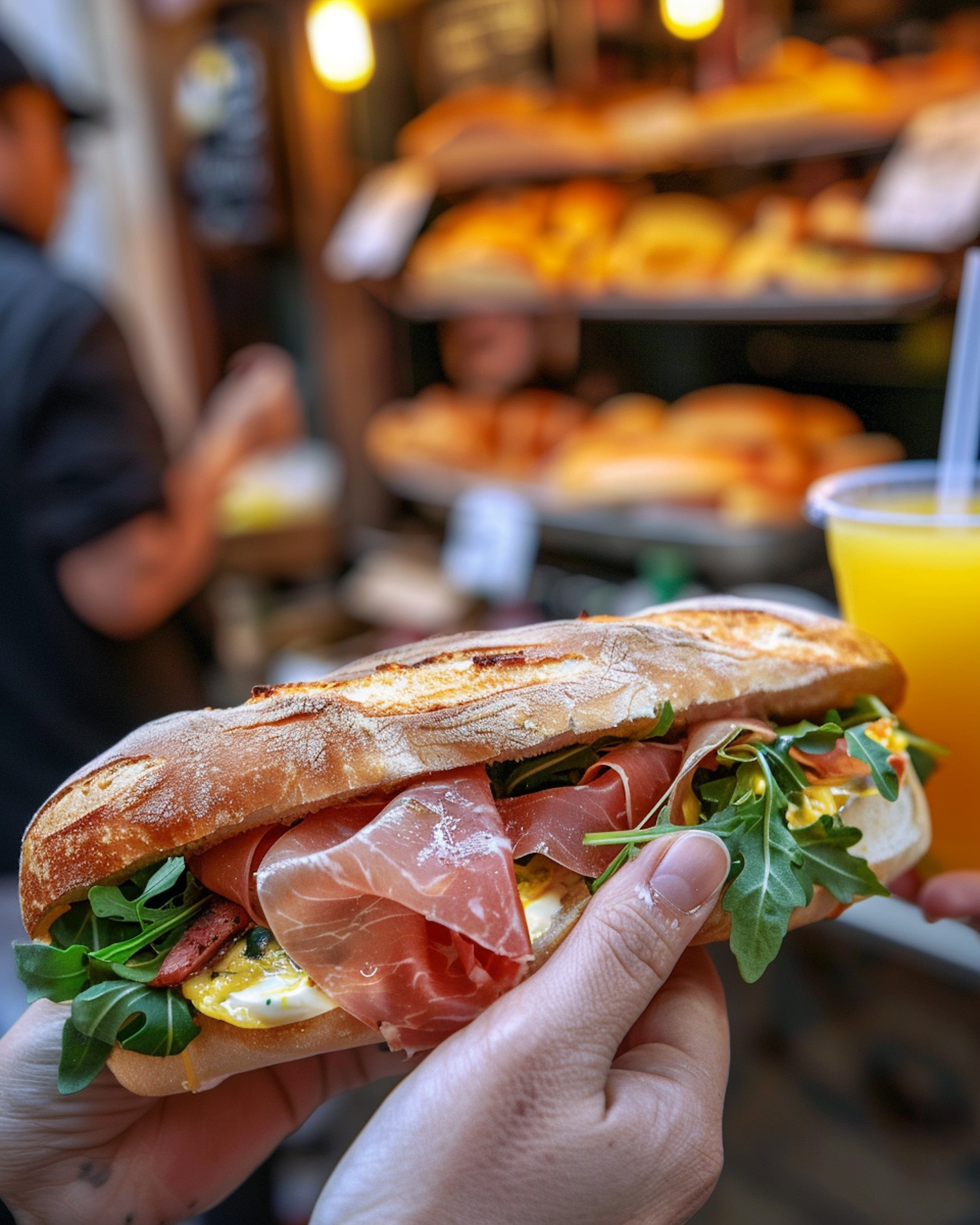 Delicious prosciutto and arugula sandwich in a bakery setting, paired with fresh orange juice. Perfect for a gourmet lunch.